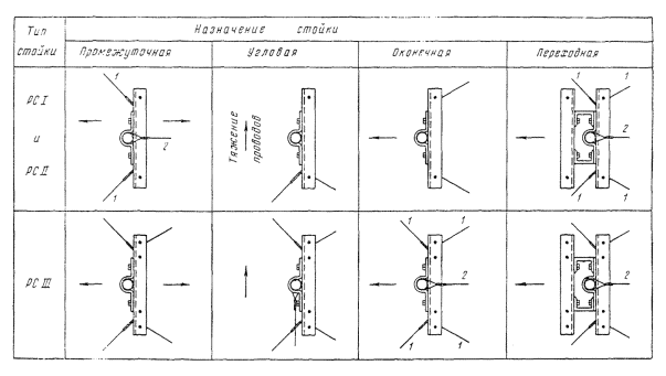 1. ПОСТРОЙКА СТОЕЧНЫХ ЛИНИЙ РАДИОТРАНСЛЯЦИОННЫХ СЕТЕЙ1.1. Типы и основные размеры стоек1.1.1. В зависимости от назначения стойки могут быть: а) промежуточными, устанавливаемыми та прямолинейных участках линии; б) угловыми, устанавливаемыми в местах изменения направления линии; в) переходными, устанавливаемыми в местах пересечения цепей радиотрансляционных сетей (PC) с контактными сетями наземного электротранспорта, линиями электропередачи и линиями связи; г) оконечными, устанавливаемыми на конце радиотрансляционной линии. 1.1.2. В качестве угловых, оконечных, переходных стоек и стоек для совместной подвески используются промежуточные стойки с усиленным креплением их оттяжками и с дополнительными траверсами. 1.1.3. Стойки изготовляются следующих типов: PCI, PCII, PCIII (ГОСТ 8715-68). Основные размеры стоек должны соответствовать табл. 1.1. Таблица 1.1 Типы и размеры стоек