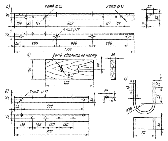 Рис. 1.29. Детали восьмипарной станционной двусторонней стойки: а) траверса; б) угловая сталь; в) доска; г) хомут.