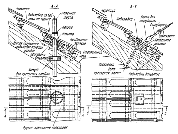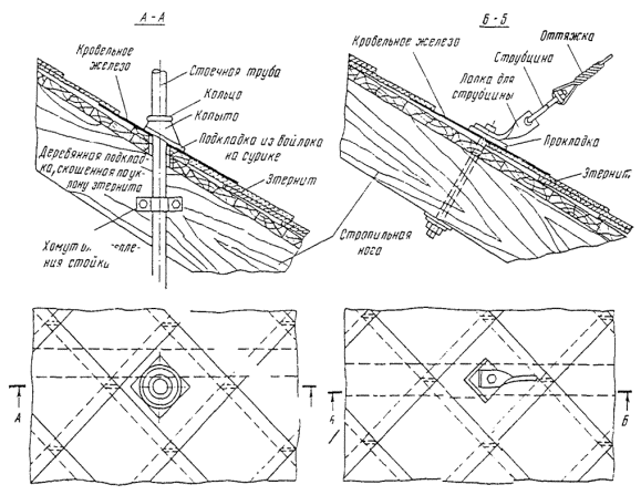 Рис. 1.35. Установка стойки на крыше с однослойной этернитовой кровлей.