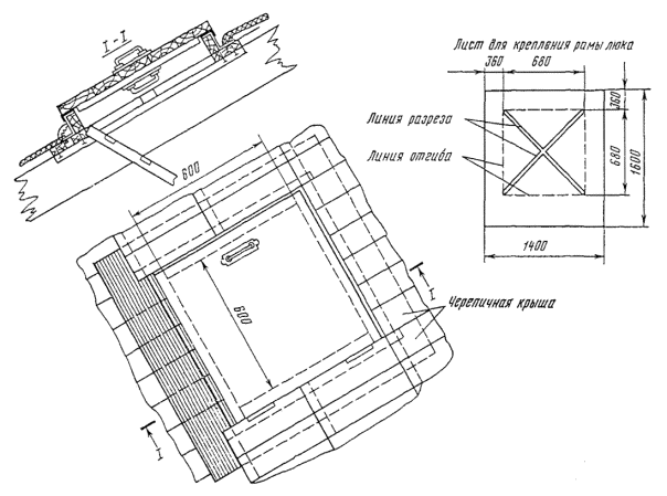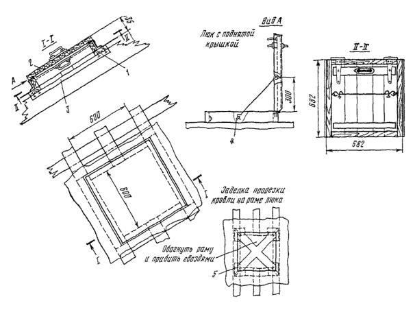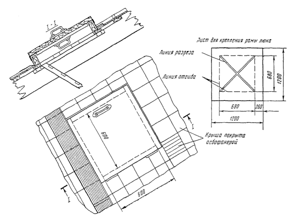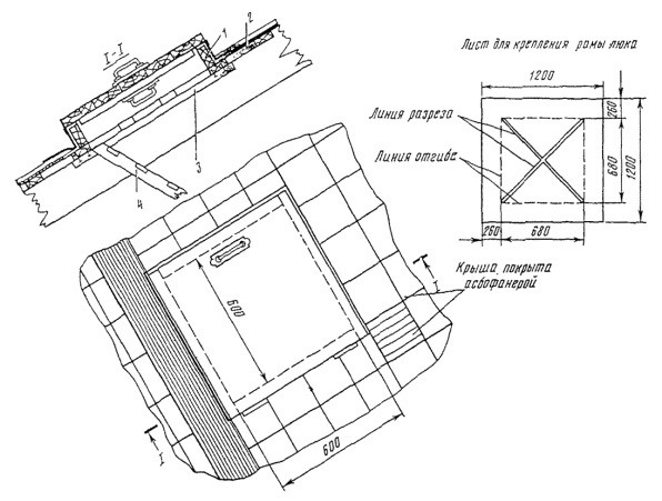Рис. 1.41. Люк для выхода на асбофанерную кровлю: 1 - люк для выхода на кровлю; 2 - лист для крепления рамы люка; 3 - брусок; 4 - лестница.