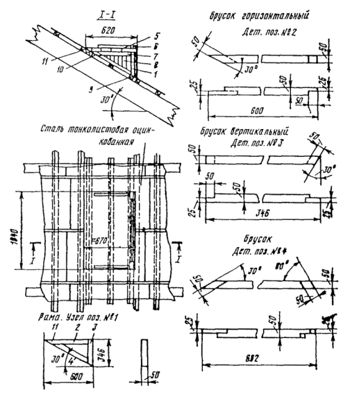 Рис. 1.42. Люк для выхода на этернитовую кровлю. Рис. 1.43. Люк для выхода на черепичную кровлю. Крышки люков должны быть оборудованы упорами, предохраняющими их от самозакрывания при ветре. При отсутствии возможности устройства люка от слухового окна до стойки подвешивают предохранительные провода или стальные канаты, а вдоль каната оборудуют трапы (рис. 1.44 и 1.45). Провод из стальной оцинкованной проволоки должен иметь диаметр не менее 5 мм. Рис. 1.44. Крепление предохранительного троса к стойке и слуховому окну. Рис. 1.45. Устройство мостков для подхода к стойке. Предохранительный провод надежно, с помощью болтов, закрепляется на слуховом окне и заделывается скруткой на планке, укрепленной на стволе стойки, на высоте 0,8 м от поверхности кровли в соответствии с «Правилами техники безопасности при работах на воздушных линиях связи и радиофикации» (М., «Связь», 1972). Надежность предохранительного провода и крепления проверяется ежегодно. 1.5.14. На домах, имеющих кровлю из шифера, черепицы, дранки и рубероида (толя), с уклоном 30° и выше, у стоек должны оборудоваться люки и рабочие площадки (рис. 1.46). Трапы на таких кровлях не устанавливаются. Рис. 1.46. Рабочая площадка у стойки (общий вид): 1 - рама (2 шт.); 2 - брусок горизонтальный (2 шт.), сосна; 3 - брусок вертикальный (2 шт.), сосна; 4 - брусок (2 шт.), сосна; 5 - брусок (2 шт.), сосна; 5 - брусок (1 шт.), сосна; 7 - доска (настил 0,02 м3), сосна; 8 - доска (обшивка 0,02 м3), сосна; 9 - брусок (4 шт.), сосна; 10 - гвозди 4,5×125, сталь; 11 - гвозди 2,5×30, сталь. Примечания: 1. Бруски (поз. 5 и 6), обернутые сталью тонколистовой оцинкованной, прибить гвоздями к настилу, поверх стального листа. 2. Бруски (поз. 3 и 4) изменяются по длине, в зависимости от подъема крыши. 3. Деталировка площадки дана для наклона крыши 30° к горизонту. При другом наклоне изготовление деталей должно производиться с учетом фактического наклона крыши. Листы обшивки следует изогнуть по конфигурации площадки и соединить в замок. Нижнюю сторону листа обшивки следует выпустить на кровлю. При отсутствии люка на кровлях с уклоном менее 30° от слухового окна или от края крыши прокладывают трапы и подвешивают предохранительные провода. 1.5.15. Ограждения высотой не менее 0,6 м должны устраиваться на крышах жилых зданий высотой 10 м и более при уклоне крыши более 10° в соответствии со СНиП II-Л.1-62. 1.5.16. Рабочие площадки, мостки и трапы делают из еловых или сосновых досок толщиной не менее 3,5 см, скрепленных поперечинами (см. рис. 1.45), и надежно скрепляют с кровлей при помощи болтов, глухарей или гвоздей. 1.5.17. На зданиях с совмещенной железобетонной кровлей для облегчения установки стоек типа PCIII в гильзы допускается устанавливать сначала только ствол стойки без траверс, а затем после укрепления ствола оттяжками на нижнем ярусе производить крепление на стволе стойки траверс и других съемных деталей. 1.5.18. Провода, выходящие из стойки, на открытом (воздушном) участке прокладываются в эбонитовой трубке или в металлическом рукаве диаметром 16 мм. 1.6. Подвеска проводов на стоечных линиях1.6.1. В качестве проводов для подвески на стоечных линиях PC применяются: - стальная линейная проволока диаметром 4; 3 и 2,5 мм (ГОСТ 1668-73); - биметаллическая сталемедная проволока марки БСМ-1 или БСМ-2 диаметрами 4; 3; 2 и 1,6 мм (ГОСТ 3822-61); - биметаллическая сталеалюминиевая проволока марки БСА диаметрами 4,3 и 5,1 мм (ЧМТУ-4-24-70); - сталеалюминиев