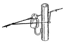 1.6.3. Все работы, связанные с подвеской проводов на стоечных линиях, должны проводиться при строгом соблюдении «Правил техники безопасности при работах на воздушных линиях связи и радиофикации» (М., «Связь», 1972). 1.6.4. Провода стоечных линий от станционной, оконечной или контрольной стойки разматывают с ручного тамбура, укрепленного на крыше, или вручную в такой последовательности: 1) бухту проволоки или ручной тамбур подают на крышу здания; для предохранения провода от повреждения под бухты прокладывают доски; 2) для передачи проволоки с крыши на крышу (по трассе линии) с крыш спускают концы веревок на землю, где они соединяются между собой, и после чего веревку натягивают между зданиями; 3) на крыше, где находится бухта, конец проволоки привязывается к веревке и перетаскивается (три небольшом натяжении) на крышу соседнего здания. Аналогичный процесс перетяжки проводов продолжается и далее. При ручной размотке бухту следует повертывать, давая ей разные направления. 1.6.5. Стальная и сталеалюминиевая проволока перед подвеской должна быть вытянута. Вытягивать биметаллическую сталемедную проволоку не допускается, неровные места и изгибы проволоки в данном случае выравниваются деревянным молотком на плоском куске дерева. Стальная проволока вытягивается следующим образом. Один конец проволоки зажимается в блочную лапку, которая при помощи петли или хомута закрепляется у основания опоры (стойки); другой конец проволоки зажимается в лапку блочной пары, закрепленной у основания опоры, находящейся на расстоянии до 6 - 8 пролетов от первой опоры. Величина усилия при вытягивании проволоки контролируется динамометром, установленным между лапкой и блоками, и должна соответствовать величинам, указанным в табл. 1.8. Проволоку, уже подвешенную на изоляторах, крюках или траверсах, вытягивать нельзя. Таблица 1.8 Величины усилия при вытягивании стальной проволоки