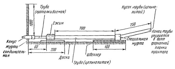 3.9.5. В населенных пунктах нельзя засыпать землей или заваливать мостовыми покрытиями и материалами сточные каналы и решетки, пожарные краны и люки различного рода подземных сооружений. 3.9.6. Дно траншеи должно быть выравнено, очищено от камней и щебня. 3.9.7. Изменение глубины траншеи должно проходить по плавной наклонной линии, без резких уступов. 3.9.8. Длина выкапываемой траншеи должна быть равна длине кабеля, прокладываемого за один рабочий день. Если по условиям работы траншея оставляется открытой на ночь, то она должна быть ограждена и около нее установлен световой сигнал. Кроме того, там, где нужно, через траншею устанавливают временные пешеходные мостики с перилами. 3.9.9. Однопарные кабели прокладывают в траншею с переносного тамбура. Если вдоль трассы можно проехать на автомашине, то кабель перематывают на барабан и устанавливают на козлах, так, чтобы он свободно вращался при размотке. 3.9.10. Одночетверочные и многопарные кабели прокладывают с барабана, установленного на автомашине или на кабельной тележке. 3.9.11. Во всех случаях барабан с кабелем при размотке должен равномерно вращаться. Разматывать кабель, вытягивая колец его с неподвижного барабана, не разрешается. 3.9.12. Кабель должен укладываться посередине дна траншеи. Если в одну траншею укладывается несколько кабелей (PC или СТС), то они должны лежать параллельно и не перекрещиваться. Одночетверочные высокочастотные кабели должны находиться на дне траншеи на максимальном расстоянии друг от друга. 3.9.13. После того как кабель уложен, траншею засыпают слоями земли по 15 - 20 см, причем каждый слой плотно утрамбовывают. В первом слое грунта не должно быть камней и других предметов, которые при утрамбовке могут повредить кабель. В населенных пунктах траншею покрывают верхним покрытием, а в поле - дерном. 3.9.14. При прокладке кабеля нельзя нарушать водоспуски и дренажные устройства. В тех случаях, когда избежать прокладки кабеля в зоне полотна шоссейных или железных дорог невозможно, все водоспуски и дренажные устройства, если они попали в трассу, должны быть восстановлены. 3.9.15. Поверхность засыпанной траншей следует восстанавливать только после осадки грунта. 3.9.16. Для облегчения и ускорения прокладки кабеля ручным способом на коротких участках подземных линий траншею роют с промежутками в 5 м. Затем в нее с помощью домкрата проталкивают стальной штырь длиной 2,5 - 2,6 м диаметром 12 - 15 мм. Чтобы пробить весь промежуток (5 м), посередине его отрывают дополнительную яму шириной 20 - 30 см, как показано на рис. 3.5. Оставшуюся часть промежутка пробивают с другой стороны. Кабель протягивают через отверстие при помощи проволоки диаметром 3 - 4 мм, загнутой в виде небольшого кольца на конце. Рис. 3.5. Способ прокладки кабеля ручным способом на коротких участках подземной линии (размеры даны в см). 3.10. Устройство переходов через водоемы и овраги3.10.1. При пересечении больших рек кабель прокладывают, как правило, в трубах, подвешенных или уложенных под фермами моста. Резервные переходы не устраиваются. В тех случаях, когда по мосту проложить кабель невозможно, кабель прокладывают по дну реки. 3.10.2. Переход через судоходную реку кабеля линий СТС или PC необходимо устраивать на глубоком месте и на расстоянии не ближе 300 м от пристаней, переправ или мест стоянки судов. Дно реки в месте перехода должно быть без 