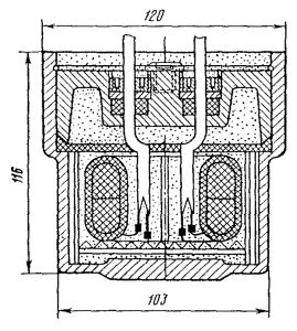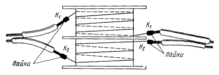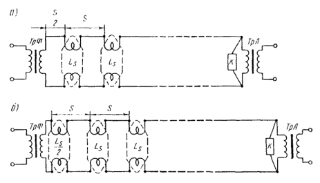 ПРИЛОЖЕНИЕ 3ПУПИНОВСКИЕ КАТУШКИ И КОРРЕКТИРУЮЩИЕ КОНТУРЫПупиновские катушки для подземных линий PC Пупиновская катушка без сердечника делается из кабеля ПРВПМ-0,8 (ПРППМ-0,8). Число витков 230. Индуктивность 10 мГ. Сопротивление катушки постоянному току 4,5 Ом, сопротивление изоляции не менее 50 МОм (рис. П.3.1). Для магистральных фидерных линий из кабеля МРМ (МРМП) индуктивность пупиновских катушек 20 мГ. Схема включения катушки приведена на рис. П.3.2. Выводные концы пупиновских катушек PC должны быть из кабеля, имеющего оболочку той же рецептуры, что и кабель подземной линии. Рис. П.3.1. Пупиновская катушка для подземных линий PC. Рис. П.3.2. Схема включения пупиновской катушки. Пупиновские катушки для подземных линий СТС 1. Пупиновская катушка имеет индуктивность 70 ± 1,5 мГ. Сопротивление катушки постоянному току 6 Ом. Сопротивления полуобмоток постоянному току должны отличаться не более чем на 0,15 Ом. Сопротивление изоляции между каждой полуобмоткой и другой полуобмоткой, соединенной с корпусом, 1000 МОм (рис. П.3.3). Рис. П.3.3. Пупиновская катушка для подземных линий СТС. 2. Ящики с пупиновскими катушками разрешается транспортировать автогужевым транспортом при температуре не ниже - 10 °С, причем сбрасывание ящиков или перевертывание их не допускается. 3. Пупиновские катушки должны храниться в сухом закрытом помещении при температуре не ниже - 30 °С и не выше + 50 °С. При хранении катушек без упаковки необходимо тщательно оберегать их от воздействия дневного света и солнечных лучей. 4. Перекладывание пупиновских катушек из ящика в какое-либо другое место допускается при температуре не ниже - 5 °С. 5. Выводные концы пупиновских катушек PC и СТС должны быть из кабеля, имеющего оболочку той же рецептуры, что и кабель подземной линии. Корректирующие контуры 1. В корректирующем контуре (рис. П.3.4) катушка L1 имеет 2210 витков провода ПЭЛШО или ПЭШО диаметром 0,41 - 0,50 мм, намотанных на круглый каркас из прессшпана; диаметр каркаса 70 мм, ширина между щечками 40 мм, диаметр начального витка 20 мм. Рис. П.3.4. Схема корректирующего контура для линий PC. 2. Катушка контура L2 имеет 205×2 витков провода ПЭ диаметром 0,60 - 0,75 мм, намотанных на каркас катушки. 3. Конденсаторы C1 и С2 имеют бумажную изоляцию и рассчитаны на постоянное рабочее напряжение не ниже 400 В. 4. Сопротивления R1 и R2 могут быть проволочные из высокоомного провода диаметром 0,26 - 0,29 мм или непроволочные типа ВС на допустимую мощность рассеивания 5 - 10 Вт. 5. Детали контура монтируются на отдельной панели из изоляционного материала и помещаются в металлический влагонепроницаемый кожух типа линейного трансформатора, который заливается церезином или другой изолирующей массой. 6. Для коррекции частотной характеристики непупинизированного магистрального фидера (кабелей МРМ или МРМП) должна быть использована цепочка из последовательно соединенных R = 200 ÷ 300 Ом и С = 0,06 - 0,1 мкФ. Характеристика пупинизированной магистральной фидерной линии производится путем установки из последовательно соединенных L = 20 мГ, С = 8 мкФ, R = 1500 ÷ 2000 Ом. Окончательная подгонка элементов корректирующих цепочек производится на линии при подключении реальной нагрузки. Корректирование частотной характеристики проводится при пониженном напряжении на входе магистрального фидера, равном 10 % от номинального. Элементы корректирующих цепочек устанавливают в шк