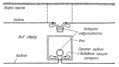 где Zaб - входное сопротивление громкоговорителя при частоте 400 Гц; Nаб - число абонентских точек. Абонентские цепи PC, у которых Zвх окажется значительно меньше этой величины, должны быть проверены, а обнаруженные неисправности устранены. 3.16.12. В том месте, где включается катушка индуктивности, вытягивают петлю кабеля длиной 1 м, после чего прокладку кабеля продолжают. Затем вырывают яму, достаточную для работы по установке катушки. На дне ямы делают углубление по размерам катушки с таким расчетом, чтобы проводники, выходящие из катушки, были уложены по дну котлована с некоторым запасом (рис. 3.18). Рис. 3.18. Укладка кабеля в местах установки пупиновских катушек. Чтобы избежать повреждения кабеля, яму отрывают рядом с трассой кабеля. Каждую полуобмотку катушки индуктивности включают последовательно в жилу кабеля (рис. 3.19). Рис. 3.19. Включение полуобмотки пупиновской катушки в жилу кабеля. 3.16.13. Перед установкой катушки индуктивности проверяют целость полуобмоток и выводов путем их прозвонки и величину сопротивления изоляции между каждой полуобмоткой по отношению к другой полуобмотке, соединенной с корпусом. Величина сопротивления должна быть не менее 1000 МОм для катушек LS = 70 мГ и 50 МОм для LS = 10 мГ. 3.16.14. После того как катушка установлена, ее засыпают слоем разрыхленной земли, поверх которого устраивается защитное покрытие из кирпича, бетонной плитки или из доски, пропитанной битумом. Затем яму засыпают и утрамбовывают. 3.16.15. Место установки пупиновской катушки должно быть отмечено на план-карте трассы линии с привязкой к местности. 3.16.16. По мере включения в линию пупиновских катушек со стороны станции должно измеряться сопротивление шлейфа цепи и сопротивление изоляции жил по отношению к земле. На линиях PC необходимо также проверять правильность включения катушек путем измерения волнового сопротивления линии Zc на двух-трех частотах (400, 1000, 2000 Гц). 3.17. Кабели, применяемые для линий PC и СТС3.17.1. Типы кабелей, применяемых для PC и СТС, приведены в табл. 3.4. Таблица 3.4 Типы кабелей или проводов, применяемых для линий PC или СТС