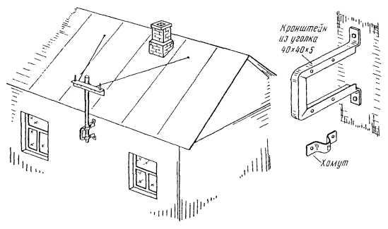Рис. 1.33. Детали шестипарной станционной стойки для вывода цепей напряжением до 360 В включительно: а) траверса; б) доска; о) угловая сталь; г) хомут. 1.4.3. Места установки стоек должны быть выбраны такими, чтобы провода и части стоек не затрудняли доступа к устройствам, расположенным на крышах, например, к дымовым трубам, слуховым окнам и т.д. При этом необходимо: - избегать близости дымовых труб, так как выходящие газы разрушают провода; - следить за тем, чтобы провода были достаточно удалены от выступающих над крышами частей зданий, и соблюдались нормы расстояний (габаритов) по отношению к деталям зданий и к другим линиям. 1.4.4. На зданиях с железобетонными кровлями или с железобетонными стропилами, в целях уменьшения шума в верхних этажах от вибрации проводов, стойки устанавливают над лестничными клетками или над шахтами лифтов. При невозможности установки стоек над лестничными клетками или над шахтами лифтов следует предусмотреть специальные меры по устранению шума в зданиях от проводов (см. п. 1.5.7). 1.4.5. Разметку на кровле мест крепления оттяжек (расстановку стропильных болтов с ушком) надо производить с таким расчетом, чтобы угол наклона оттяжки к горизонту был не более 45°, а угол, образуемый оттяжкой и стволом стойки, соответственно не менее 45°. 1.4.6. При разбивке трассы стоечной линии следует избегать удлиненных пролетов, т.е. пролетов, длины которых превышают максимально допустимые для линейных проводов разных материалов и диаметров. 1.5. Установка и крепление стоек1.5.1. Строительные материалы и стойки доставляются на крыши зданий согласно указаниям «Правил техники безопасности при работах на воздушных линиях связи и радиофикации» (М., «Связь», 1972). 1.5.2. Для уменьшения нагрузки на стропила и для соблюдения габарита линии стойки должны располагаться возможно ближе к коньку крыши. Вертикальные усилия, возникающие в трубах стоек при максимальных нагрузках для различных проводов и типов линий, приведены в табл. 1.6. Расчет вертикальных усилий производится по формулам приложения 1. Таблица 1.6 Вертикальные усилия, возникающие в трубах стоек