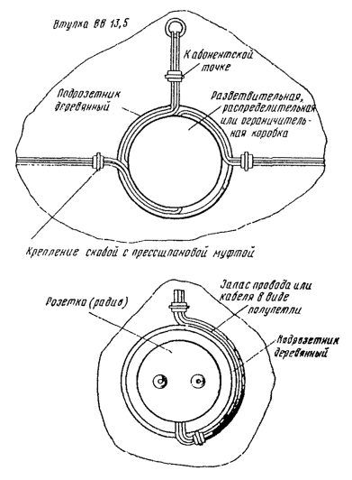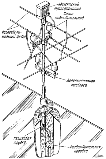 Примечание. Длина шурупов указана для крепления роликов на неоштукатуренных деревянных стенах. На каменных стенах длина шурупов должна быть увеличена на 15 мм, а на оштукатуренных деревянных - на 25 мм. 5.2.26. Заделка проводов ПРЖ, ПТВЖ, ПВЖ, ПТПЖ на вводных изоляторах производится, как указано на рис. 5.5 - 5.7. Для удобства заделки конец вводного провода поворачивают вокруг шейки изолятора на полтора оборота (см. 3 на рис. 5.3). 5.2.27. При групповом вводе провода с изоляторов проходят через стену в помещение лестничной площадки и прокладываются скрытым или открытым способом до разветвительной коробки, устанавливаемой на лестничной площадке (см. разд. 5.6). 5.2.28. Фидерный ввод со столбовой линии II класса оборудуется так же, как и абонентский групповой ввод, с тем отличием, что в данном случае провода прокладываются не до разветвительной коробки, а до места установки абонентского трансформатора. В домах, построенных по индивидуальным типовым проектам, проводка выполняется только скрытым способом, за исключением зданий, сооружаемых из лесоматериалов. 5.2.29. Вводные изоляторы на здании устанавливают вблизи лестничной клетки. При наличии нескольких лестничных клеток рекомендуется оборудовать фидерный ввод в ближайшую от вводного столба лестничную клетку. 5.2.30. В многоэтажных домах питание радиоточек осуществляется от проводов, подключаемых к выходу абонентского трансформатора, установленного на первом или втором этаже. 5.2.31. Питание радиоточек, установленных в квартирах, расположенных на нескольких лестничных клетках, при наличии одного фидерного ввода в радиофицируемое здание осуществляется путем прокладки по лестничным клеткам проводов, подключения их к абонентскому трансформатору или разветвительной коробке через соединительные линии, проложенные по чердачному помещению (рис. 5.12). Рис. 5.12. Схема построения радиотрансляционной сети в доме. 5.2.32. Абонентский ввод в дом со стоечной линии осуществляется через абонентский трансформатор, укрепленный на стойке, устанавливаемой на крыше здания (рис. 5.13). Стойки должны устанавливаться ближе к коньку крыши так, чтобы провода и части стоек не затрудняли доступа к дымовым трубам, слуховым окнам и другим устройствам, а также, чтобы провода не проходили над дымовыми трубами. Рис. 5.13. Устройство абонентского ввода со стоечной линии. 5.2.33. Провода ввода соединяются с голыми проводами воздушной линии при помощи сжимов или, как исключение, при помощи перевязочной проволоки («британской» спайки). Для удобства заделки конец вводного провода на стойке поворачивается вокруг шейки изолятора на один-полтора оборота. Место соединения вводного провода с линейным следует покрасить масляной краской либо асфальтовым лаком, обмотав предварительно место соединения изоляционной лентой. 5.2.34. Провода ПРЖ, вышедшие из стойки в чердачное помещение, закрепляют каждый в отдельности свободно без натяжения на первой паре роликов типа Р-25 или Р-32. Если применяются провода ПТВЖ, ПТПЖ, ПВЖ, то обе жилы вышедшего из стойки провода крепятся под скобку. Ролики или скобки устанавливаются на стропильной балке на расстоянии не более 20 см от стойки. После того как провода укреплены на первой паре роликов или под скобкой, их включают в разветвительную коробку, которая устанавливается также на стропильной балке, а затем прокладыв