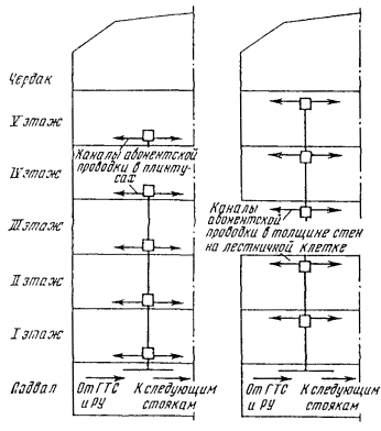 Примечания: 1. Все провода с медными жилами можно применять для телефонной проводки и для стояков PC в домах с повышенной этажностью. 2. При устройстве ввода через стойку надо выполнять следующие правила монтажа проводов: - при протягивании провода ПТВЖ через трубу стойки обе жилы его соединяют параллельно и используют как один провод; - при устройстве абонентского ввода PC или СТС оба провода ввода помещают в одной полутвердой резиновой трубке; - если абонентский ввод РС устраивают в здании, где нет чердачного помещения или это помещение есть, но оно непригодно для нормальной эксплуатации разветвительных коробок, а также в здании, где оборудуется только одна радиоточка и увеличения числа радиоточек не предвидится, то каждую жилу провода ПТВЖ или ПТЖ вводят в трубу стойки в отдельной полутвердой резиновой трубке. 3. В домах с большой нагрузкой радиотрансляционных точек, когда провода со стальными жилами по электрическим параметрам непригодны, разрешается применять провода с медными жилами. 4. При оборудовании групповой распределительной сети многопрограммного вещания в зданиях прокладывается трехпарный кабель типа КРВПС (при отсутствии его допускается прокладка трех пар проводов) и устанавливается обычная распределительная арматура для включения обычных громкоговорителей. 5.4. Устройство чердачной проводки5.4.1. При вводе через трубу стойки в здания, имеющие более одной лестничной клетки, разводка проводов к лестничным клеткам проводится по чердаку (рис. 5.24). Разводка по чердаку должна проводиться и в тех случаях, когда ввод в здание осуществляется со столбовой линии в ближайшую от места ввода лестничную клетку. При совместной прокладке проводов и кабеля радиотрансляционной и телефонной сетей по чердаку необходимо соблюдать те расстояния между ними, которые приведены в п. 5.5.5. В зданиях, выполненных из железобетона, прокладка чердачных проводов осуществляется в стальных трубах или в металлорукаве. Крепление труб или металлорукава к строительным железобетонным перекрытиям осуществляется при помощи металлических накладок. Рис. 5.24. Разводка проводов к лестничным клеткам. 5.4.2. Провода с хлопчатобумажной изоляцией прокладывают по чердачному помещению на роликах, а провода с поливинилхлоридной или полиэтиленовой изоляцией - под скобки или прибивают стальными (каблучными) гвоздями. Расстояние между роликами и скобками указано в разд. 5.8. 5.4.3. Провода прокладываются по стропильным балкам чердака, переходы с одной балки на другую проводятся по специально прибиваемым доскам толщиною 20 мм и шириной 90 мм. Если между стропилами расстояние 120 см и менее, то доски прибивать не следует. 5.4.4. В чердачных помещениях зданий индивидуального пользования провода крепятся только к стропилам. Между стропилами провода свободно провисают. 5.4.5. Ролики Р-25 и Р-32 в чердачном помещении устанавливают на стропильных балках или досках сбоку или снизу для каждого провода в отдельности так, чтобы провод в случае его провисания не ложился на доску или стропильную балку. Расстояние между проводами должно быть 35 мм. Ролики крепят шурупами. В исключительных случаях промежуточные ролики должны укреплять гвоздями. 5.4.6. Спуск проводов к проходам, отверстиям, в чердачном перекрытии делается по доскам (размер 20×90), прибиваемым одним концом к стропилам, а дру