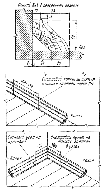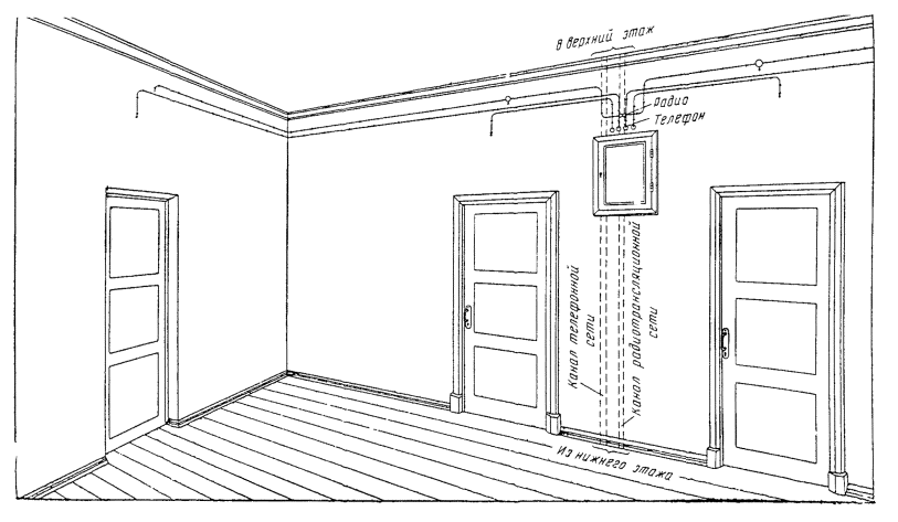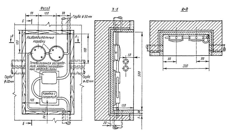 5.5.10. В домах с глинобитными стенами провода и арматуру укрепляют к каркасу здания. 5.5.11. Канализация для скрытой проводки образуется из непрерывной линии трубопроводов и специально оборудованных шкафов, устраиваемых в толще элементов или в пустотелых элементах конструктивной части здания. Специально оборудованные ниши устраиваются только в стенах зданий, а смотровые коробки можно устраивать и в перекрытиях. 5.5.12. Трубопроводы, специально оборудованные линии и смотровые коробки скрытой проводки должны обеспечивать возможность замены и дополнительной прокладки кабелей и проводов в процессе их эксплуатации. Диаметр канала должен быть не менее 50 мм. 5.5.13. Как правило, вертикальные каналы для скрытой проводки следует устраивать без применения металлических труб. Каналы можно устраивать из асбоцементных, пластикатовых, бетонных труб в пустотелых элементах конструктивной части здания, а также путем оставления соответствующих углублений в стенах здания в процессе его строительства с соответствующей отделкой. 5.5.14. Каналы могут иметь круглую, прямоугольную, овальную и треугольную формы. Треугольная форма допускается только в галтелях. 5.5.15. Размер каналов для всех жилых зданий должен быть: - на вводах в здание - диаметром 25 мм; - в стенах, полах и перекрытиях для распределительной телефонной, радиотрансляционной сетей и сети коллективного телевизионного приема - диаметром 50 мм для круглой формы, 60×60 мм для прямоугольной формы и 40×70 для овальной формы; в полах и перекрытиях может быть допущено устройство каналов круглой формы, имеющих диаметр 40 мм, с тем, чтобы прокладка всех кабелей и проводов производилась в нескольких каналах; - на ответвлениях к абонентам для телефонной, радиотрансляционной сетей и сети коллективного телевизионного приема - диаметром 40 мм для круглой формы, 40×40 мм для прямоугольной формы и 35×60 мм для овальной формы. 5.5.16. Прокладка кабелей и проводов между нишами по вертикали должна осуществляться в отдельных каналах диаметром не менее 40 мм: - для телефонной сети; - для радиотрансляционной и телевизионной сети. В плинтусах и галтелях размер каналов должен быть 15×30 мм для прямоугольной и 25×25×35 мм для треугольной формы (рис. 5.32). Рис. 5.32. Прокладка кабелей и проводов в плинтусах и в галтелях. 5.5.17. При определении числа каналов должно учитываться устройство общего канала для радиотрансляционной сети и сети коллективных антенн. 5.5.18. Ниши слаботочных устройств (телефона, телевидения и радиотрансляции) следует располагать на расстоянии не менее 200 мм с левой стороны от трубопроводов и ниш электросети. Допускается устройство ниш телефонных, телевизионных и радиотрансляционных сетей совместно с нишами электросети, но эти ниши должны быть разделены и иметь отдельные дверцы с запорами. 5.5.19. Специально оборудованные ниши разделяются на монтажные, поворотные и абонентские. Монтажные ниши применяются: - для телефонных распределительных коробок, для разветвительных и ограничительных коробок радиотрансляционной сети, а также для арматуры коллективного телевизионного приема (см. рис. 5.29); - для разветвительных и ограничительных коробок радиотрансляционной сети и арматуры коллективного телевизионного приема (рис. 5.33); эти ниши устраиваются тогда, когда размеры лестничной клетки не позволяют установить общую нишу; Рис. 