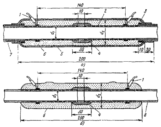 4.2. Электрохимическая защита свинцовой оболочки должна осуществляться так, чтобы создаваемые потенциалы на всей поверхности оболочки находились в пределах -0,7 ¸ -1,3 В по отношению к медносульфатному электроду сравнения.