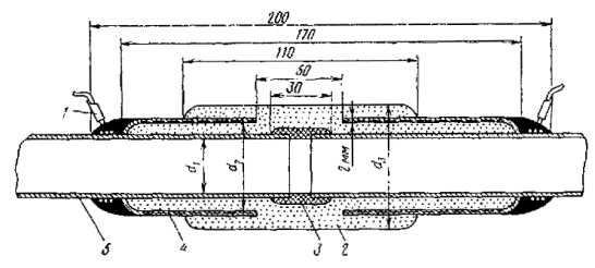 2.8. Визуальный осмотр кабеля производится в следующей последовательности: отрывается котлован, отбирается проба грунта, кабель очищается от грунта на расстоянии 1,5 м в каждую сторону от чугунной муфты, снимается чугунная муфта, накладывается бандаж на джут на расстоянии 1,2 м от конусов муфты, отбираются пробы джута с обеих сторон на расстоянии 0,8 м от конуса муфты, накладывается бандаж с обеих сторон на броню на расстоянии 1,1 м от конуса муфты, накладывается бандаж на подушку на расстоянии 1,0 м от конуса муфты с обеих сторон, отбираются пробы подушки на расстоянии 0,8 м от конусов муфты с обеих сторон, удаляется подушка, оценивается коррозионное состояние оболочки. Результаты осмотра оформляют актом.