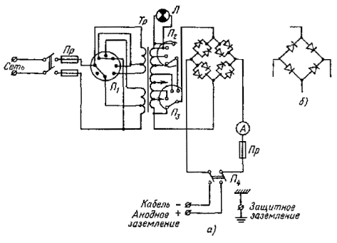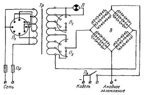 - установки, в цепь которых включены вентильные элементы (диоды) соответствующей мощности, обеспечивающие прохождение электрического тока только в одном направлении. Поляризованные токоотводы устанавливаются в знакопеременных зонах, на подземных сооружениях. |