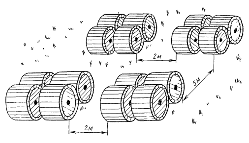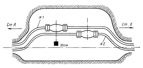 8.31. Стенки котлована должны иметь откосы, а в слабых грунтах должны быть укреплены досками или заранее подготовленными щитами в соответствии с разд. 5 настоящего Руководства. В сыром грунте со значительным поступлением воды в одном из углов котлована (ближе ко входу) следует выкопать приямок глубиной 0,4 - 0,6 м для сбора и отлива (откачки) воды во время монтажа. 8.32. Перед началом работ в колодце кабельной канализации необходимо: установить оградительный знак; при помощи газоанализатора проверить, нет ли в колодце взрывоопасных и других вредных газов и провентилировать его; при наличии воды откачать ее и просушить колодец (особенно потолок); установить лестницу; оборудовать освещение. 8.33. До разделки концов кабеля над местом монтажа (котлованом, колодцем) должна быть установлена специальная палатка. Вход в палатку должен быть вдоль трассы линии со стороны, противоположной направлению ветра. Края палатки по всему периметру (кроме входа) следует прижать к поверхности грунта. Спаечный инструмент и монтажные детали должны быть расположены внутри палатки (колодца) на клеенке. ПРОВЕРКА КАБЕЛЯ ПЕРЕД МОНТАЖОМ8.34. Непосредственно перед подготовкой концов кабелей к монтажу следует проверить величину избыточного давления воздуха в подлежащих сращиванию отрезках кабелей (строительных длинах, шагах, секциям), а также измерить сопротивление изоляции защитных изолирующих покровов. Если давление соответствует ранее зафиксированным данным, а сопротивление изоляции находится в пределах нормы, концы кабеля подготавливают к монтажу. Если хотя бы в одном из кабелей величина давления или сопротивление изоляции не соответствуют необходимым требованиям, вскрытие концов для монтажа не производится до устранения выявленных недостатков. 8.35. В качестве заземления при измерениях сопротивления изоляции защитных покровов сращиваемых отрезков кабеля используется забитый в землю стальной стержень любого профиля длиной 0,5 - 0,7 м. Способ устранения повреждений на шланге изложен в разд. 12. 8.36. Если в процессе приемки кабеля в монтаж были проведены электрические измерения элементов сердечника кабеля, повторные измерения непосредственно перед монтажом не производят. В противном случае должна быть сделана проверка целости жил и экрана (прозвонка), измерено электрическое сопротивление изоляции, а в коаксиальных парах и электрическая прочность. Схема прозвонки кабеля показана на рис. 8.9. Электрические измерения должны соответствовать требованиям разд. 16 настоящего Руководства. Результаты прозвонки и измерений должны быть зафиксированы в протоколах по установленным формам. Рис. 8.9. Схема прозвонки элементов кабеля 8.37. Если в процессе прозвонки и измерений хотя бы в одном из кабелей проверяемые параметры окажутся не соответствующими необходимым требованиям, монтаж муфты не производится до устранения выявленных недостатков. ПОДГОТОВКА И РАЗДЕЛКА КОНЦОВ КАБЕЛЯ8.38. Выложить кабели на дне котлована (рис. 8.10) так, чтобы сращиваемые концы перекрывали друг друга в соответствии с размерами, приведенными в табл. 8.3. Рис. 8.10. Расположение муфт в котловане: а - в одну сторону от оси трассы; б - в обе стороны Расстояние от оси трассы кабеля до продольной оси муфты при одном кабеле должно быть не менее приведенного в табл. 8.3. При расположении в одном котловане нескол