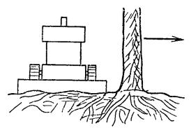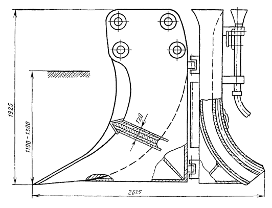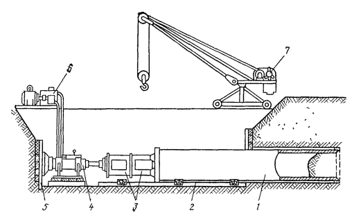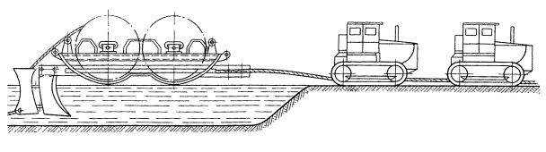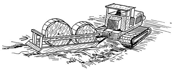 6.18. При механизированной разработке траншей, а также при бестраншейной прокладке кабеля (механизмами с расклинивающими грунт ножами) на загородных участках линия трассы должна отмечаться вехами, расстояние между которыми определяется пределами видимости. В населенных пунктах расстояние между вехами должно быть 40 - 50 м. При разработке траншей вручную линия разбивки должна отмечаться шнуром. 6.19. В лесистой местности предварительно должна производиться разбивка просеки, здесь осевую линию трассы обозначают вехами, устанавливаемыми в пределах видимости. Затем следует вырубить просеку по визирной линии, после чего она вырубается на всю ширину в соответствии с проектом. 6.20. В процессе разбивки трассы следует определить места (большие бугры и выемки, крутые берега рек или спуски в овраги), где требуется планировка местности перед прокладкой кабеля. 6.21. Если трасса КЛС запроектирована на местности, занятой посевами, необходимо перед прокладкой оформить разрешение землепользователей на производство работ в соответствии с согласованиями, обусловленными в проектной документации. 6.22. При прокладке кабеля в гористой местности, по крутым склонам, через овраги, на крутых берегах рек первоначально следует произвести разбивку осевой линии, а затем двух боковых, параллельных осевой, ограничивающих ширину изгибов зигзагообразной траншеи (см. рис. 5.4). 6.23. Расстояние от прокладываемого магистрального или внутризонового кабеля до других подземных и наземных сооружений при сближении и пересечении с последними определяются проектом и должно соответствовать нормам, приведенным в табл. 6.1. ПРОКЛАДКА КАБЕЛЯ КАБЕЛЕУКЛАДЧИКАМИ6.24. До начала работы кабелеукладочной колонны трасса, в необходимых случаях, должна быть спланирована бульдозером (срезка бугров, засыпка выемок, образование плавных спусков на пересечении оврагов и водоемов) для обеспечения равномерной глубины заложения кабеля. 6.25. В грунтах I - III групп на загородных участках трассы, а также в других местах, где это возможно, прокладка кабеля должна осуществляться кабелеукладчиками (рис. 6.1). В грунтах значительной плотности, где могут иметь место выглубления ножа, а также при наличии по трассе каменистых включений, корней деревьев и других препятствий должна производиться предварительная пропорка грунта. Пропорка производится специальным прицепным пропорщиком типа ПГ-1В (рис. 6.2), ножевым кабелеукладчиком (без кабеля в кассете), или другим пригодным для этой цели механизмом. Рис. 6.1. Прокладка кабеля ножевым кабелеукладчиком: 1 - передний нож-рыхлитель; 2 - барабаны; 3 - кабель; 4 - корпус кабелеукладчика, 5 - кассета; 6 - ролики в кассете; 7 - нож рабочий. Рис. 6.2. Пропорщик грунта типа ПГ-1В. 6.26. В грунтах IV группы допускается прокладка кабеля кабелеукладчиками с расклинивающими ножами при условии проведения предварительной многократной пропорки грунта на проектную глубину. В грунтах IV и V групп, разрыхленных взрывным способом, также допускается прокладка бронированных кабелей кабелеукладчиками с расклинивающими ножами, при этом должна быть произведена многократная пропорка трассы; в местах выглубления пропорочного ножа необходимо выполнить дополнительное рыхление. 6.27. Для прокладки в сухих грунтах симметричных кабелей всех марок емкостью до 4×4, небронированных кабелей в алюминиевой