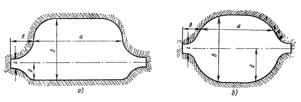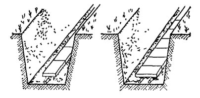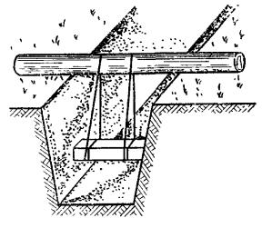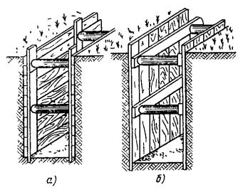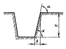 5.31. Разработка траншей в мерзлых грунтах без предварительного рыхления допускается одноковшовыми экскаваторами с ковшом емкостью до 0,5 м3 при толщине мерзлого слоя до 0,25 м. При глубине промерзания более 0,25 м следует производить предварительное рыхление грунта на всю глубину промерзания с удалением разрыхленного грунта одноковшовым экскаватором либо разрабатывать траншеи на полную глубину роторными экскаваторами в соответствии с их техническими характеристиками. Рекомендуется применение роторного экскаватора типа ЭТР-134, баровой машины типа ДГП-3УМ или цепного траншейного экскаватора типа ЭТЦ-208А. 5.32. Для предотвращения деформации профиля вырытой траншеи (осыпка грунта, заполнение снегом, размыв ливневыми водами), а также смерзания отвала грунта, темпы земляных работ и прокладки кабеля должны быть, как правило, одинаковыми. Разработка траншей в задел не рекомендуется (за исключением траншей в скальных грунтах в летнее время). 5.33. На склонах оврагов, крутых подъемах и спусках от 30 до 45° должна быть вырыта зигзагообразная («змейкой») траншея с максимальным отклонением от осевой прямой линии 1,5 м на длине 5 м (рис. 5.4). При уклонах от 30 до 45° прокладывается кабель с обычной броней, а при уклонах свыше 45° - с проволочной броней. Рис. 5.4. Зигзагообразная траншея при уклоне 30 - 45°. КРЕПЛЕНИЕ СТЕН ТРАНШЕЙ И КОТЛОВАНОВПри превышении указанных глубин рытье траншей и котлованов допускается только при условии крепления вертикальных стенок (рис. 5.5) или при устройстве откосов допустимой крутизны. Рис. 5.5. Крепление стенок траншей: а - горизонтальное; б - вертикальное Рис. 5.6. Определение крутизны откоса Примечание. Угол откоса a измеряется в градусах, а крутизна откосов определяется как отношение глубины разработки Н к проекции откоса А на горизонтальную плоскость (рис. 5.6). Допустимые углы a и крутизна откосов траншей и котлованов приведены в табл. 5.2. 5.35. Рытье траншей и котлованов в мерзлых грунтах всех пород, за исключением сухого песчаного, можно вести с вертикальными стенками без креплений на всю глубину их промерзания. При углублении ниже уровня промерзания должно производиться крепление. 5.36. Траншеи и котлованы в сухих песчаных грунтах независимо от степени промерзания следует разрабатывать с обеспечением откосов установленной крутизны или же с устройством креплений вертикальных стенок. 5.37. Рытье траншей и котлованов в отогретых (размороженных) грунтах следует производить также с обеспечением необходимой крутизны откосов или с устройством креплений в тех случаях (местах), когда глубина отогретого участка превышает размеры, указанные в п. 5.34. Таблица 5.2 Максимально допустимая крутизна откосов траншей и котлованов