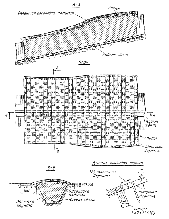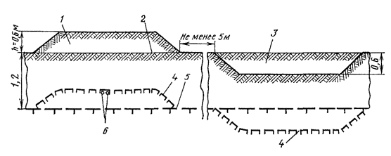 5.38. На пересечениях с железнодорожными и трамвайными путями стенки траншей и котлованов следует обязательно крепить. 5.39. Необходимость и объем крепления стен траншей и котлованов определяется проектно-сметной документацией. ЗАСЫПКА ТРАНШЕЙ И КОТЛОВАНОВ5.40. Перед засыпкой траншей и котлованов все подземные сооружения (кабель, трубы, муфты и т.д.) должны быть зафиксированы на планшетах рабочих чертежей проекта с «привязкой» к постоянным ориентирам. 5.41. Засыпка траншей, как правило, должна производиться бульдозерами или специальными траншеезасыпщиками. 5.42. На городских участках траншеи необходимо засыпать с послойным (толщиной не более 20 см) трамбованием. На улицах и пересечениях дорог с усовершенствованными покрытиями места разрытий необходимо засыпать песчаным грунтом с послойным трамбованием и поливкой водой. Оставшаяся после засыпки земля в городах и крупных населенных пунктах должна вывозиться в специально отведенные места. 5.43. Траншеи, имеющие крепление стенок, засыпаются после снятия крепления. Если разборка крепления невозможна (опасна), последние могут быть оставлены частично или полностью в траншее и засыпаны. 5.44. После прокладки кабеля (трубопровода) на загородных участках трассы над траншеей или щелью от ножа кабелеукладчика должен быть образован холмик из оставшегося или взрыхленного грунта для компенсации после его усадки. РЕКУЛЬТИВАЦИЯ ЗЕМЕЛЬ5.45. Техническая рекультивация земель при строительстве линейных сооружений КЛС заключается в снятии плодородного слоя почвы до начала строительных работ, транспортировке его к месту временного хранения и нанесения его на восстанавливаемые земли после окончания строительных работ. 5.46. Рекультивация земель, нарушенных при строительстве, должна производиться в полном соответствии с проектом. 5.47. В проекте рекультивации земель в соответствии с условиями предоставления земельных участков в пользование и с учетом местных природно-климатических особенностей должны быть определены: границы угодий по трассе кабельной линии связи, в которых необходимо проведение рекультивации; толщина снимаемого плодородного слоя почвы по каждому участку, подлежащему рекультивации; ширина зоны рекультивации в пределах полосы отвода; место расположения отвала для временного хранения снятого плодородного слоя почвы; способы снятия, транспортировки и нанесения плодородного слоя почвы и восстановления ее плодородия; допустимое превышение нанесенного плодородного слоя почвы над уровнем ненарушенных земель. 5.48. Работы по снятию, транспортировке, организации хранения и нанесению плодородного слоя почвы производятся силами строительной организации; восстановление плодородия почв (внесение удобрений, вспашка, боронование посева, известкование и т.д.) производится землепользователями, которым передаются (возвращаются) эти земли, за счет средств, предусмотренных сметой на рекультивацию. 5.49. Снятие, транспортировка и нанесение плодородного слоя почвы должно производиться, как правило, до наступления устойчивых отрицательных температур. При необходимости производства работ в зимний период плодородный слой почвы должен быть снят и складирован до его промерзания. В исключительных случаях по согласованию с землепользователями и органами, осуществляющими государственный ко