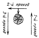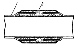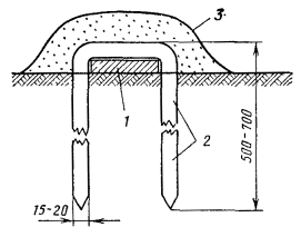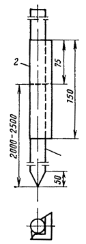 Рис. 20.7. Стальной вкладыш для забивки труб: 1 - труба; 2 - вкладыш 20.17. Чтобы не повредить края трубы при забивке в грунт, в верхний конец ее вставляют стальной вкладыш с головкой, которая опирается своими заплечиками на срез трубы (см. рис 20.7). Нижний конец трубы, забиваемый в грунт, предварительно сплющивают, как показано на рис. 20.6. 20.18. Перед забивкой электродов в грунт для каждого из них копают яму глубиной 0,8 м. Электрод забивают в центре ямы так, чтобы верхний конец возвышался над уровнем дна ямы на 10 см. 20.19. Для соединения электродов между ними прорывают траншею шириной 20 - 30 см и глубиной 0,5 - 0,7м, на дно которой укладывают соединительные провода или шины. В качестве соединительных могут быть использованы стальные шины сечением 40×4, 30×4, 25×4. Шины укладывают на ребро и приваривают к уголковым или трубчатым электродам. Вместо стальных шин можно применять стальные провода ПС-70 или биметаллические сталемедные провода диаметром 4 - 6 мм. 20.20. Соединение электродов из уголков с помощью стальной шины показано на рис. 20.8, а, с помощью проводов - на рис. 20.8, б. Соединение трубчатых заземлителей проводами показано на рис. 20.9. Если количество соединительных проводников превышают два, то их свивают между собой с шагом скрутки 0,1 - 0,25 м. Рис. 20.8. Заземления для защиты кабелей от ударов молнии: а - соединение с заземлением провода ПС-70 или шины для защитных контуров, б - соединение с заземлением проводов для искровых промежутков: 1 - хомутик из перевязочной проволоки, 2 - стальная проволока диаметром 4 - 5 мм, 3 - витки пропаять Рис. 20.9. Соединение трубчатых электродов проводами: 1 - проволока стальная диаметром 4 - 5 мм, 2 - проволока перевязочная диаметром 2 мм, 3 - восемь витков пропаять 20.21. При устройстве рабочих заземлений во всех грунтах, а защитных - в агрессивных, соединительные провода на всем протяжении до выхода на поверхность изолируют от земли двухслойным покрытием асфальтового лака. После выполнения указанных работ траншею засыпают землей. 20.22. Заземлители для искровых промежутков рекомендуется соединять с токоотводным проводом двумя проводами диаметром 4 - 5 мм (см. рис. 20.8, б). 20.23. В процессе выполнения строительных работ число электродов в контуре может уточняться по результатам измерений сопротивления растеканию тока при последовательном наращивании устанавливаемых электродов. При этом число электродов, необходимое для обеспечения нормы сопротивления заземления, может отличаться от проектируемого как в сторону увеличения, так и в сторону уменьшения. 20.24. Конфигурацию контура определяют исходя из количества электродов и местных условий. Заземлители в местах с высоким удельным сопротивлением грунта20.25. В местах с высоким удельным сопротивлением грунта рекомендуется обрабатывать грунт солью, что позволяет снизить сопротивление растеканию тока заземлителя в 2,5 - 8 раз. Примерная конструкция котлована при обработке грунта солью показана на рис. 20.10. Работа проводится в следующем порядке. В месте, где должен быть забит электрод, вырывают котлован глубиной 2,5 м, диаметром 0,8 - 1,0 м и сечением 1×1 м. В котлован укладывают поочередно слои грунта и вдвое тоньше слои соли. Соль смачивают водой и утрамбовывают. Для обработки следует применять соли, не увеличивающие коррозию стали: нитрат натрия и гидрат окиси кальция, не следует применять хлористый натрий, х
