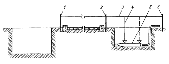 потенциалов между сооружением и землей может быть определена по формуле 18.113. При необходимости измерения разности потенциалов кабеля относительно земли на участках между контрольно-измерительными пунктами используется метод выноса заземляющего электрода. Этот метод заключается в том, что в контрольно-измерительном пункте (колодце или шурфе) измерительный прибор подключают к кабелю, а электрод сравнения располагают или на поверхности земли над кабелем при измерениях на кабелях, проложенных в траншеях (рис. 18.15, а), или в свободном канале при измерениях на кабелях, проложенных в канализации (рис. 18.15, б), Электрод сравнения располагают в тех местах, где необходимо определить потенциал. Расстояние от точки подключения прибора к кабелю до точки выноса электрода сравнения не должно превышать 250 м. Рис. 18.14. Схема измерения разности потенциалов кабеля относительно земли в колодце (а), в контрольно-измерительном пункте (б) и в турфе (в): 1 - штанга со свинцовым электродом; 2 - кабель; 3 - неполяризующийся электрод; 4 - штанга с зубчатым электродом Рис. 18.15. Схема измерения разности потенциалов кабелей относительно земли по методу выноса электрода, проложенных в грунте (а) и в канализации (б) 1 - контрольно-измерительных пункт, 2 - электрод сравнения; 3 - кабель; 4 - катушка с проводом, 5 - свободный канал; 6 - электрод со свинцовым наконечником 18.114. При измерениях электроды сравнения устанавливают на дно колодца в случае измерений на кабелях, проложенных в канализации, и на поверхности земли над кабелем при измерениях на кабелях, проложенных непосредственно в земле. Примечание. Если дно колодца (или земля), с которым осуществляется контакт через электрод сравнения, сухое, то перед измерением его необходимо увлажнить. 18.115. В зонах отсутствия блуждающих токов время измерения в каждой точке может быть ограничено 3 - 5 мин. Отсчеты должны производиться через каждые 15 - 20 с. В зонах влияния блуждающих токов трамвая отсчеты необходимо производить через 10 - 20 с в течение 5 - 10 мин, а при частом движении вагонов - через каждые 5 - 10 с. В зонах влияния блуждающих токов электрифицированных железных дорог отсчеты необходимо производить через каждые 10 с в течение 10 - 15 мин. Необходимо, чтобы за период измерений мимо пункта наблюдения прошло не менее, чем по два электропоезда (трамвая) в разных направлениях. При необходимости выполнения длительных измерений разностей потенциалов оболочек кабелей связи относительно земли целесообразно применять регистрирующие приборы типов Н-373, Н-39, Н-399 и др. 18.116. Результаты измерений разностей потенциалов оформляются в виде протоколов по форме 18.4. Протокол измерений эффективности защиты должен заполняться по форме 18.5. Форма 18.4