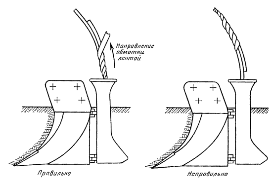 4.51. При проверке низкочастотных (нч) кабелей на площадке следует обращать внимание на наличие данных о симметрировании строительной длины на заводе, на что указывает надпись на барабане «Симметрирован». Ведомость симметрирования должна быть приложена к протоколу электрических испытаний; в случае отсутствия ведомости для ее составления, необходимо на кабельной площадке произвести прозвонку жил кабеля. 4.52. После электрических испытаний кабель в металлической оболочке (за исключением кабелей типа ВКПАП и ЗКА) должен быть установлен под внутреннее избыточное воздушное давление. 4.53. Вывозить барабаны с кабелем, оборудование и различные устройства на трассу, осуществлять их прокладку, установку и монтаж без протоколов испытаний не разрешается. РЕМОНТ КАБЕЛЯ4.54. При выявлении в кабеле многочисленных заводских дефектов необходимо вызвать на площадку хранения представителя предприятия-поставщика для составления совместного акта и предъявления рекламации. В случае неявки представителя завода акт составляется с участием представителя инспекции по качеству, а при отсутствии в данном пункте соответствующей инспекций или неявке его - с участием компетентного представителя другой организации (управления связи, эксплуатационного предприятия). 4.55. Если при внешнем осмотре или в процессе испытаний в строительных длинах кабеля обнаруживаются незначительные неисправности (повреждена обшивка, ослаблены болты, наличие вмятин, дефекты в заделке концов и т.д.), они должны быть устранены. Одновременно заводу-поставщику следует сообщить о выявленных заводских дефектах. 4.56. Ремонт барабанов (тары) должен производиться по возможности без перемотки кабеля. При ремонте следует соблюдать осторожность, чтобы не допустить повреждения кабеля. Если барабан поврежден настолько, что ремонт его не обеспечивает безопасности перевозки и размотки, кабель должен быть перемотан на исправный барабан, причем на щеке последнего в укладочной ведомости и в протоколе испытаний строительной длины делается отметка «Перемотан». При этом следует иметь в виду, что конец А остается в нижнем повиве барабана. 4.57. При ремонте кабеля необходимо, в первую очередь, привести к норме сопротивление изоляции, потом устранить обрыв или сообщение (если таковые обнаружены) и только после этого исправлять оболочку. В процессе ремонта должны быть приняты меры, обеспечивающие предохранение кабеля от проникновения атмосферной влаги через отверстия в оболочке. Для этого барабан до полного окончания ремонта должен находиться под навесом или накрыт толью, клеенкой и т.д. 4.58. При обнаружении какого-либо повреждения в строительной длине (вызвавшего нарушение электрических норм всех или отдельных жил), которое не может быть выявлено при внешнем осмотре, на кабельной площадке производятся измерения (с обоих концов кабеля) для определения места повреждения. Если устранить повреждение путем вскрытия только оболочки невозможно, поврежденный участок кабеля должен быть вырезан, а оставшиеся отрезки кабеля проверены путем измерений. Потом проверяют герметичность оболочки и оба конца наматывают на один барабан; на барабане и в протоколе испытаний указывают количество кусков кабеля и длину каждого из них. 4.59. Места нарушения герметичности оболочки кабеля определяются при помо