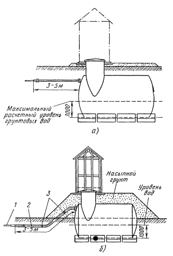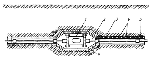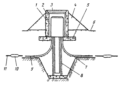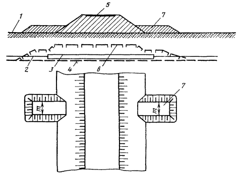 21.25. Фундаментные блоки скрепляют между собой металлическими тяжами (диаметром 20 мм ст. A-III), продетыми в подъемные петли цистерны и приварены к ним (рис. 21.5). Рис. 21.5 Схемы крепления цистерн НУП к фундаментным блокам Ф-1: 1 - цистерна; 2 - фундаментные блоки Ф-1; 3 - тяжи; 4 - хомуты; 5 - монтажные петли; 6 - петли на цистерне 21.26. Работы по рытью котлована и монтажу конструкций должны выполняться в соответствии с требованиями СНиП II-4-80 «Техника безопасности в строительстве», «Правил техники безопасности при работах на кабельных линиях связи и проводного вещания», «Правил устройства и безопасной эксплуатации грузоподъемных кранов». УСТАНОВКА И ЗАКРЕПЛЕНИЕ ЦИСТЕРНЫ НУП21.27. Перед установкой цистерны НУП на фундамент необходимо: проверить правильность установки блоков Ф-1, засыпать грунтом пазухи до верха блоков и оформить акт на скрытые работы по устройству фундамента; произвести внешний осмотр цистерны, восстановить поврежденную гидроизоляцию; проверить укомплектованность цистерны НУП (крышки люка, лестницы, кронштейны, болты и т.д.). 21.28. В грунте, насыщенном грунтовыми водами, необходимо работы по монтажу фундаментов и цистерны производить при непрерывном водоотливе сразу после окончания рытья котлована на проектную глубину. Также без перерыва во времени произвести тщательную засыпку котлована с послойным трамбованием грунта. 21.29. Цистерна НУП должна быть закреплена на фундаменте при помощи металлических хомутов, охватывающих нижние подъемные петли на цистерне и тяжи на фундаментных блоках. Сварку всех закрепляющих цистерну узлов с фундаментом необходимо производить с помощью электродов Э-42. 21.30. При всех вариантах установки цистерны НУП на трассе ее горловина должна быть выше верхнего уровня паводковых вод не менее чем на 250 мм над уровнем земли и не менее 100 мм над уровнем пола наземной части. 21.31. На установку цистерны должен быть составлен акт на скрытые работы. ЗАСЫПКА КОТЛОВАНА21.32. Засыпка подземной части НУП производится в присутствии представителя заказчика после оформления актов на скрытые работы. Засыпка котлована должна производиться слоями толщиной 15 - 20 см с трамбованием. Особенно тщательно трамбовать грунт необходимо при установке цистерн НУП в сырых местах, а также под металлическими уголками или трубами для ввода кабелей. 21.33. Вводы кабелей в подземную часть НУП необходимо выполнять одновременно с засыпкой котлована. Кабели связи на вводе укладывают на металлические уголки 75×75×7, которые одним концом закрепляют хомутами на патрубках цистерны НУП, а другим опираются на материковый грунт дна траншеи (рис. 21.6). Уголки и хомуты из полосовой стали 30×4 изготавливаются в мастерских строительных организаций и поставляются на трассу в комплекте. Рис. 21.6. Ввод кабеля в подземную часть НУП: 1 - цистерна; 2 - патрубок цистерны; 3 - уголок; 4 - хомут из полосовой стали 30×4; 5 - кабель; 6 - стягивающий болт; 7 - материковый грунт 21.34. Засыпка вводных кабелей должна производиться с большой осторожностью, чтобы не допустить их повреждений. Тщательно должна быть засыпана и уплотнена траншея на подходе кабеля к НУП для исключения возможности поступления воды по траншее под цистерну НУП. 21.35. При выполнении работ в зимний период запрещается производить засыпку мерзлым грунтом. Одерновку и посев многолетних трав произвести после оттаивания г