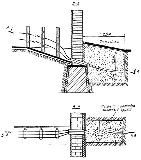 19.9. К основным мерам защиты подземных кабелей от повреждений ударами молнии относятся: применение грозостойких кабелей (тип кабеля определяется проектом); прокладка параллельно кабелю подземных металлических хорошо заземленных проводов (тросов); включение малогабаритных разрядников между жилами и оболочкой (в специальных муфтах); использование воздушной линии, проходящей параллельно кабелю и оборудованной искровыми разрядниками с вынесенными заземлениями. 19.10. Защите от ударов молнии не подлежат независимо от условий прокладки и удельного сопротивления земли: кабели в металлической оболочке без наружного шлангового покрова или группа таких кабелей, проложенных в одной траншее, если сопротивление постоянному току металлических покровов кабеля (или группы кабелей) не превышает Rм.п = 0,2 Ом/км (за исключением защиты от заземленных опор ВЛ напряжением 35 кВ и выше); для участков со скальным грунтом и в районах вечной мерзлоты указанное значение Rм.п в соответствии с проектом может быть уменьшено; кабели, проложенные в населенных пунктах с густой сетью подземных коммуникаций или проводов воздушных линий связи, радиофикации и электроснабжения (за исключением защиты от заземленных опор ВЛ напряжением 35 кВ и выше); кабели, проложенные вдоль полотна железной дороги или подземного трубопровода на расстоянии не более 10 м от них (за исключением защиты от опор ВЛ, ЛС (PC) и автоблокировки). 19.11. Защита кабелей, проложенных на антенном поле радиостанций, обязательна вне зависимости от удельного сопротивления грунта и продолжительности гроз. Защиту осуществляют с помощью двух тросов ПС-70 или двух биметаллических проводов диаметром 4 мм, прокладываемых на расстоянии 0,8 м друг от друга. Тросы прокладывают на глубине 0,4 м симметрично относительно кабеля. 19.12. В случае расположения отдельных деревьев, опор (подпор, оттяжек) ЛС или ЛЭП высотой h > 6 м на расстоянии a £ 1,5 h от трассы кабеля, между последним и деревом или опорой необходимо проложить шину, трос или провода сечением 12 мм2 по меди или 70 мм2 по стали. Для районов вечной мерзлоты или грунтов с высоким удельным сопротивлением расстояние а в соответствии с проектом может быть увеличено. Схемы прокладки защитных проводов (тросов) с целью перехвата токов молнии показаны на рис. 19.1. Сопротивления заземлений должны быть не более значений, указанных в табл. 20.4. Рис. 19.1. Схемы для перехвата токов молнии, попавших в дерево, с помощью защитного троса, проложенного в земле между кабелем и деревом: а - расстояние от центра дерева до кабеля, b - расстояние от оси, проходящей параллельно кабелю через дерево, до заземления, h1 - глубина заложения кабеля; h2 - глубина заложения защитного троса (0,4 м £ h1 < h; b ³ 2 м, если а ³ 10 м; b ³ 5 м, если 5 < а < 10 м; b ³ 10 м, если а £ 5 м) 19.13. При невозможности проложить между деревом (опорой) и кабелем защитный трос (провод) рекомендуется на отдельно стоящем дереве (опоре) оборудовать молниеотвод. Молниеотвод должен выступать над верхней точкой дерева на 10 - 15 см. Выполняют его из стального оцинкованного провода диаметром 4 мм. На высоте 3 - 4 м от поверхности земли молниеотвод должен быть соединен с высоковольтным кабелем или проводом в шланге (толщина шланга не менее 4 мм). Другой конец соединительного кабеля (провода) подключают к заземлению, расположенному (рис. 19.2) на расстоянии 25 - 30 м от за