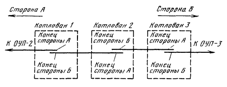 8.23. Одновременно с предъявлением в монтаж кабеля монтажному подразделению должны быть переданы: а) укладочные ведомости, составленные по форме 4.5 с указанием величин избыточного давления, сопротивления изоляции шланговых покровов в каждой строительной длине и разбивкой по шагам пупинизации; б) протоколы измерений и испытаний строительных длин по форме 4.2; в) заводские паспорта (протоколы, сертификаты) на строительные длины кабеля. 8.24. При приемке кабеля в монтаж подлежит проверке: а) соответствие длин усилительных участков проектным; б) соблюдение номинальных длин шагов пупинизации; в) герметичность оболочки; г) электрическое сопротивление изоляции шланговых покровов; д) электрическая прочность и электрическое сопротивление изоляции, а также целость всех жил (проводников) и экранов; е) глубина заложения кабеля в местах стыка строительных длин; ж) достаточность перекрытия концов кабелей в месте стыка строительных длин; з) правильность расположения кабелей в траншее; и) соблюдение требований по группированию строительных длин; к) наличие и правильность временной нумерации муфт (на стыках длин). Строительные длины, не соответствующие перечисленным требованиям, подлежат повторной приемке. 8.25. Приемка кабеля в монтаж оформляется актом по форме 8.4. Акт составляется в четырех экземплярах (по два для каждой стороны). НУМЕРАЦИЯ УСИЛИТЕЛЬНЫХ (РЕГЕНЕРАЦИОННЫХ) ПУНКТОВ КОНЦОВ КАБЕЛЯ, ШАГОВ ПУПИНИЗАЦИИ, КАБЕЛЕЙ В ТРАНШЕЕ, МУФТ, ПАР И ЧЕТВЕРОК КАБЕЛЯа) нумерация обслуживаемых усилительных (регенерационных) пунктов (ОУП, ОРП, ОП, ПП) - от административного центра высшего значения (пункта А) к административному центру низшего значения (пункт Б) для радиальных кабельных линий и по движению часовой стрелки для кольцевых линий; на линиях, соединяющих административные центры примерно одинакового значения - с севера на юг и с запада на восток; для линий связи вдоль продуктопроводов (газопроводов, нефтепроводов и т.д.) - по ходу продукта в трубопроводе; б) нумерацию необслуживаемых усилительных (регенерационных) пунктов (НУП, НРП) следует вести внутри каждого участка ОУП - ОУП (ОРП - ОРП) в возрастающем порядке и записывать дробным числом; при этом в числителе указывается очередной (порядковый) номер НУП, НРП, а в знаменателе - низший порядковый номер ОУП (рис. 8.1). Нумерация усилительных пунктов должна быть указана в проектной документации; Рис. 8.1. Порядок нумерации: а - ОУП и НУП; б - муфт на высокочастотном кабеле; в - муфт на низкочастотном кабеле; г - шагов и муфт на комбинированном симметричном кабеле; д - стыковых и прямых муфт на коаксиальном кабеле; е - дополнительных муфт в) стороной А (в любой точке кабельной линии следует считать усилительный пункт низшего порядкового номера, а стороной Б - высшего; г) концы кабелей в котловане (колодце) следует именовать: конец стороны A (A1, A2, А3) - входящий кабель, а конец стороны Б (Б1, Б2, Б3) - исходящий кабель (рис. 8.2); Рис. 8.2. Обозначение концов кабеля в котловане д) концы кабелей при их разделке на оконечные устройства в ОУП (НУП, ОП) разделяются на входящие - А (A1, А2, А3 и т.д.) и исходящие - Б (Б1, Б2, Б3 и т.д.); е) концом А строительной длины кабеля следует именовать тот, у которого жилы в звездной четверке расположены по часовой стрелке в следующем порядке: красная - зеленая - желтая - синяя; на конце Б данной строительной длин