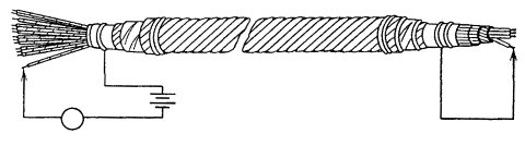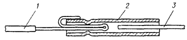 Рис. 19.10. Схема измерения тока после монтажа РТ: 1 - жилы кабеля, 2 - оболочка; 3 - редукционный трансформатор, 4 - защищаемый участок кабеля 19.45. Все работы по установке и монтажу РТ на участках сближения с электрифицированными железными дорогами переменного тока необходимо проводить до включения электротяги. При этом необходимо соблюдать общие требования по безопасности, изложенные в «Правилах техники безопасности при работах на кабельных линиях связи и проводного вещания». 19.46. Если работы проводят на действующем кабеле, и в жилах последнего длительно индуктируется повышенная ЭДС, или кабель прокладывают вдоль действующей электрифицированной железной дороги переменного тока, то необходимо соблюдать следующие дополнительные требования. Демонтаж соединительных муфт на действующих магистральных кабелях, откопка магистральных кабелей от места стыка строительных длин до котлована РТ, укладка магистральных кабелей к РТ, соединение концов магистральных кабелей и кабелей РТ прямыми соединительными муфтами внутри РТ, соединение дополнительных и магистральных кабелей в котловане (п. 19.38) осуществляют с обязательным соблюдением требований техники безопасности, изложенных в разд. 16 и «Инструкции по строительству и ремонту кабельных линий связи, на жилах которых индуктируется напряжение 400 В частотой 50 Гц». Установки РТ проводят в следующем порядке: 1) откапывают котлован для РТ (котлован А), подготавливают РТ, откапывают траншею от указанного котлована до магистральных кабелей; 2) роют котлован в месте нахождения соединительных муфт на магистральных кабелях (котлован Б); 3) откапывают магистральные кабели; 4) оборудуют временные заземления в котлованах Б и А; 5) отключают магистральные кабели на боксах по концам усилительного участка, демонтируют соединительные муфты, если работы проводят на действующем кабеле, или муфты были смонтированы до начала работ по установке РТ, укладывают магистральные кабели в траншею до РТ; 6) укладывают дополнительные кабели и подключают их к РТ; 7) соединяют концы магистральных кабелей с кабелями РТ, 8) соединяют дополнительные кабели и магистральные д котловане Б; 9) выполняют все заключительные работы по монтажу, отключению временных заземлений и т.д. 19.47. При проведении монтажа РТ следует пользоваться индикаторами напряжения: сначала высоковольтным (ИВН), затем низковольтным (ИНН). 19.48. Проверка сопротивления изоляции экрана или металлической оболочки кабеля по отношению к земле, а также целостности экрана или металлической оболочки после установки и монтажа РТ в условиях влияния электрифицированной железной дороги переменного тока должна производиться с соблюдением мер, обеспечивающих защиту персонала от поражения электрическим током в случае внезапного появления индуктированного высокого напряжения при проведении измерений. Эти меры должны соблюдаться независимо от договоренности с управлением железной дороги (п. 19.43). Перед подключением измерительного прибора к металлической оболочке (экрану.) должно быть проверено отсутствие напряжения на оболочке (экране) с помощью индикатора напряжения. УСТРОЙСТВО ИСКРОВЫХ ПРОМЕЖУТКОВ19.49. При прокладке кабелей вдоль существующих воздушных линий связи на расстоянии не более 1,5 h, где h - высота опор линии, последние могут быть использованы для защ
