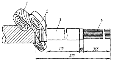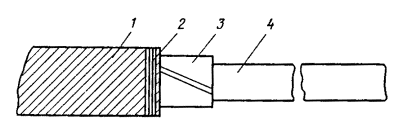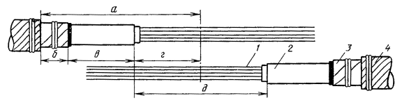 Рис. 8.12. Размеры разделки концов кабеля в свинцовой оболочке: 1 - жилы; 2 - оболочка; 3 - стальные ленты брони; 4 - пряжа Таблица 8.5 Размеры разделки концов кабеля в алюминиевой оболочке при монтаже клеевым методом или пайкой