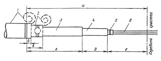 МОНТАЖ ЭЛЕКТРОДРЕНАЖНЫХ УСТАНОВОК18.64. Место включения электродренажного устройства (прямого, поляризованного, автоматического, усиленного) указывается в рабочей документации проекта и при необходимости уточняется проектной организацией при пробном включении по результатам измерений разности потенциалов защищаемого сооружения связи относительно земли в районе запроектированного места включения дренажной установки. Электродренажное устройство может быть расположено на стене здания или на специальной опоре (см. рис. 18.8). 18.65. Для защиты места соединения дренажного кабеля с проводом, идущим от рельсового пути (средней точки путевого дросселя), служат чугунные соединительные муфты типа МЧ. Марка муфты определяется при проектировании. Монтаж чугунных муфт должен осуществляться в соответствии с действующими инструкциями и руководствами. 18.66. Дренажные кабели в городах следует прокладывать в соответствии с указаниями разд. 6. 18.67. От места установки дренажа до защищаемых кабелей, отсасывающих пунктов или средних точек путевых дросселей дренажные кабели прокладывают непосредственно в земле. 18.68. Подключение дренажного проводника к рельсам осуществляют организации, эксплуатирующие трамвай и электрифицированные железные дороги. 18.69. К отсасывающему пункту на рельсовой сети трамвая дренажный кабель подключают в настенном коробе или в кабельном ящике, в который заведены кабели, идущие от тяговой подстанции трамвая и от рельсов. При отсутствии коробов и кабельных ящиков дренажный проводник присоединяют к минусовому фидеру у концевой муфты. Присоединять установки дренажной защиты к сборке линий тяговых подстанций трамвая допускается только в тех случаях, когда подключение дренажа к отсасывающему пункту не обеспечивает поддержание защитного потенциала на подземном сооружении связи. На электрифицированных железных дорогах дренажный кабель подключают к отсасывающему пункту, тяговому рельсу или к средней точке путевого дросселя. К средней точке «а» путевого дросселя дренажный кабель присоединяют под клемму питания или под специальный зажим в зависимости от конструкции соединений в дросселе (рис. 18.9). Дренажный кабель может быть подключен к точке «а» или в точках 1 и 2 дросселя. Дренажные кабели разрешается присоединять не в каждом, а через два на третий дроссельном пункте. Рис. 18.9. Схема подключения кабеля к средней точке путевого дросселя 18.70. Подключение дренажного кабеля к оболочке и броне междугородного кабеля показано на рис. 18.10. Подключение дренажного кабеля производится в такой последовательности: на наружный слой кабельной пряжи защищаемого кабеля накладывают бандажи на расстоянии 150 - 300 мм друг от друга (рис. 18.10. а); кабельную пряжу между бандажами срезают и удаляют (рис. 18.10, б); ленты или проволоки брони на расстоянии 10 - 15 мм от обоих бандажей тщательно зачищают на длине 25 - 30 мм и облуживают. Затем отдельные проволоки или ленты брони перепаивают между собой путем наложения бандажа (четыре-пять витков) из двух медных проволок поперечным сечением 2 - 2,5 мм2; внутренние концы медных проволок оставляют свободными на длину 100 - 150 мм (рис. 18.10, в); броню между внутренними бандажами срезают ножовкой-бронерезкой, подушку из кабельной пряжи и кабельную бумагу удаляют (рис. 18.10, г); к свинцовой оболочке кабеля припаивают св