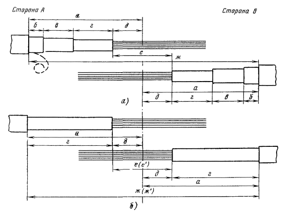 Рис. 8.14. Разделка концов кабеля в алюминиевой оболочке при монтаже муфт методом опрессования: а - бронированного (МКСАБпШп); б - без брони (МКСАШп) 8.41. Размеры разделки концов кабеля в зависимости от марки кабеля, типа муфты, метода сращивания оболочки и способа восстановления изолирующего защитного покрова приведены в табл. 8.4 - 8.8 и рис. 8.12 - 8.16. Таблица 8.6 Размеры разделки концов кабеля для сращивания алюминиевой оболочки методом опрессования