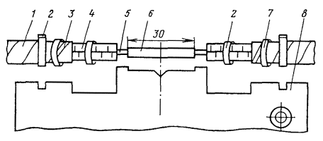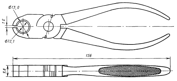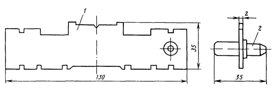 9.7. Наложить около обреза оболочки бандаж из пяти-шести витков капроновой нити на поясную изоляцию, размотать бумажные ленты и оборвать их в 5 - 7 мм от бандажа; при этом следует удерживать рукой сердечник кабеля, не допуская раскручивания бумажных лент коаксиальных пар. Зафиксировать в паспорте данные с мерных лент. 9.9. Расположить сращиваемые концы кабелей так, чтобы одноименные коаксиальные пары и звездные четверки находились друг против друга. При небольших углах несовпадения коаксиальных пар (до 90°) концы кабелей следует развернуть до совпадения. Если угол несовпадения больше, один из концов кабеля допускается разделать на новом месте, смещенном от первоначальной разделки на расстояние, зависящее от угла несовпадения. Рис. 9.1. Шаблон с калибром для разделки коаксиальных пар 2,6/9,4: 1 - шаблон; 2 - калибр Рис. 9.2. Калибр для коаксиальных пар 2,6/9,4 Рис. 9.3. Сжимы универсальные Рис. 9.4. Обрезы № 1 Рис. 9.5. Обрезы № 2 Рис. 9.6. Вилка Рис. 9.7. Установщик шайб: 1 - направляющая; 2 - ограничитель; 3 - кнопка; 4 - пружина; 5 - ручка Рис. 9.8. Вкладыш распорный Рис. 9.9. Диск распорный Рис. 9.10. Паяльник фигурный 9.10. Сдвинуть нитки, навитые поверх симметричных четверок, к обрезу поясной изоляции, затянуть их и закрепить; отогнуть четверки в сторону и прикрепить к кабелю. 9.11. Установить распорный вкладыш так, чтобы торец его находился на расстоянии 195 мм от обреза оболочки (рис. 9.12). Обжать руками коаксиальные пары на вкладыше, чтобы обеспечить параллельность осей и создать прямолинейный участок, необходимый при сращивании. Рис 9.11. Детали для монтажа коаксиальных пар 2,6/9,4: а - кольцо медное обжимное № 1 (малое); б - кольцо медное обжимное № 2 (большое); в - шайба фторопластовая; г - гильза разрезная; д - кольцо нумерационное, е - муфта медная; ж - муфта стальная; з - муфта полиэтиленовая Рис. 9.12. Установка обжимных колец № 1 и распорного вкладыша: 1 - оболочка кабеля, 2 - звездные четверки; 3 - шаблон; 4 - калибр; 5 - коаксиальная пара; 6 - распорный вкладыш; 7 - кольцо обжимное № 1 9.12. Удерживая коаксиальные пары на вкладыше, сдвинуть ранее надетые кольца (см. п. 9.8) до упора в торец вкладыша и обжать их универсальными сжимами (см. рис. 9.3) (меньшим отверстием); при этом последние должны быть расположены перпендикулярно коаксиальной паре. 9.13. Вынуть распорный вкладыш. На конце кабеля стороны А на первую и вторую коаксиальные пары надвинуть по одной полиэтиленовой изолирующей полумуфте с выступом, а на третью и четвертую - полумуфты без выступа. На конце кабеля стороны Б на первую и вторую пары надвинуть полумуфты без выступа, а на третью и четвертую с выступом. 9.14. Установить распорные диски (см. рис. 9.9) на расстоянии 130 мм от места обреза оболочки (рис. 9.13). 9.15. На расстоянии 100 мм от установленных колец обрезать лишнюю длину коаксиальных пар (рис. 9.13). Рис. 9.13. Установка распорного диска: 1 - полиэтиленовые полумуфты; 2 - распорный диск; 3 - кольцо обжимное 9.16. Размотать и оборвать около кольца бумажные ленты изоляции коаксиальных пар. Установить по шаблону на экранных лентах коаксиальной пары обрезы № 1 так, чтобы сторона обрезов, обращенная к концу пары, находилась на расстоянии 12 мм от закрепленного кольца. Размотать стальные ленты и оборвать (обрезать) их по плоскости обрезов. 9.17. Установить по шаблону на внешнем проводнике коаксиальной пары обрезы № 2 так, чтобы острая кромка обрезов была обращена к ко