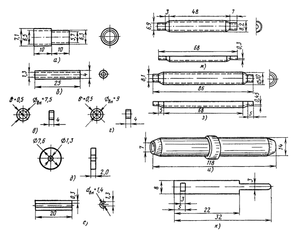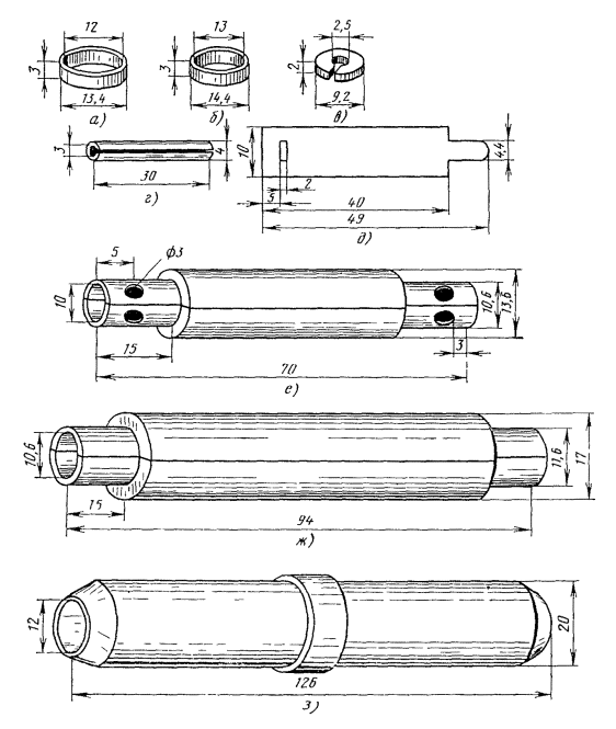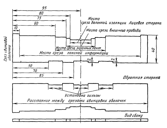 Рис. 9.29. Инструменты и приспособления для монтажа малогабаритного коаксиального кабеля типа МКТ-4: а - распорный вкладыш; б - распорный диск; в - обрезы (№ 3 - d = 5,5 мм для экрана; № 4 - d = 5,0 мм для внешнего проводника); г - сжимы (№ 1 - d = 7,8 mm для малых колец; № 2 - d = 9,0 мм для больших колец); д - паяльник фигурный Рис. 9.30. Шаблон для разделки коаксиальных пар типа 1,2/4,6 9.41. Около места среза оболочки наложить бандаж из ниток на ленты поясной изоляции, размотать и оборвать их на расстоянии 5 - 7 мм от бандажа. 9.42. Расположить сращиваемые концы кабелей так, чтобы одноименные коаксиальные и симметричные пары находились друг против друга. В противном случае необходимо развернуть сращиваемые кабели. 9.43. Симметричные пары и контрольную жилу отогнуть в сторону и временно прикрепить к кабелю. 9.44. Коаксиальные пары на выходе из-под оболочки осторожно раздвинуть на 8 - 10°, расположить между ними распорный вкладыш (рис. 9.29, а) и обжать их вдоль желобов на вкладыше для обеспечения параллельности осей коаксиальных пар и создания прямолинейного участка. Для сохранения постоянного расстояния между коаксиальными парами в процессе монтажа удалить распорный вкладыш и установить на расстоянии 35 мм от места среза оболочки распорный диск (рис. 9.29, б). Рис. 9.31. Детали для монтажа коаксиальных пар типа 1,2/4,6: а - втулка опорная медная; б - трубка полиэтиленовая опорная; в - кольцо обжимное № 3 (малое); г - кольцо обжимное № 4 (большое); д - шайба фторопластовая; е - гильза разрезная; ж - муфта медная; з - муфта стальная; и - муфта полиэтиленовая; к - кольцо нумерационное 9.45. При разделке коаксиальных пар следует пользоваться шаблоном (рис. 9.30). Размотать изолирующие (пластикатовые) ленты с коаксиальных пар, смотать их в рулончики и временно прикрепить к оболочке кабеля. Размотать экранные ленты и на расстоянии 60 мм от торца оболочки обрезать при помощи обрезов № 3 (рис. 9.29, б). 9.46. На расстоянии 15 мм от места среза стальных экранных лент (75 мм от торца оболочки) при помощи обрезов № 4 (рис. 9.29, б), обрезать внешние проводники коаксиальных пар. 9.48. Излишки внутреннего проводника обрезать на расстоянии 20 мм от места среза внешнего проводника. Обрезанный торец внутреннего проводника должен быть строго перпендикулярным и не иметь клиновидной формы, для чего боковые кусачки следует устанавливать плоской стороной к месту среза внешнего проводника. 9.49. На внешние проводники вместе с концами экранных лент коаксиальных пар надвинуть до упора (примерно на 10 мм) луженые опорные втулки (рис. 9.31, а). 9.50. На внутренние проводники одеть полиэтиленовые трубки (рис. 9.31, б) и надвинуть их до упора в пережим баллонной изоляции. Дальнейшее продвигание полиэтиленовой трубки под баллонную изоляцию на глубину 20 мм производится плоскогубцами в момент припайки опорной втулки к внешнему проводнику. 9.51. Торцы опорных втулок на 1/3 длины окружности припаять к внешнему проводнику и экранным лентам трубчатым припоем ПОССу-61-0,5. Предварительно места пайки необходимо протереть чистой тканью, смоченной в бензине Б-70. Пайку следует вести быстро, избегая перегрева и деформации изоляции коаксиальной пары. Примечание. Трубчатый припой может быть заменен прутковым той же марки и флюсом ФКСП (канифолью, разведенной в спирте). Залуживание стальных лент экрана в месте пайки производится при помощи пасты ПБК-26М. Остатки пасты долж