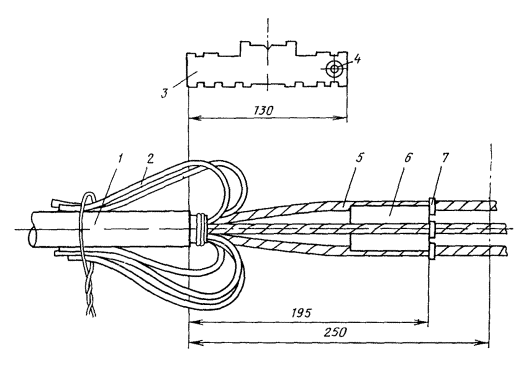 Рис. 8.15. Разделка концов кабеля в стальной гофрированной оболочке: 1 - полиэтиленовый шланг; 2 - стальная оболочка; 3 - проволоки бандажа для перепайки оболочки и экрана; 4 - алюминиевые ленты экрана; 5 - экранные проволоки; 6 - поясная изоляция; 7 - жилы Таблица 8.8 Размеры разделки концов кабеля МКСАСтпШп-4×4×1,2
