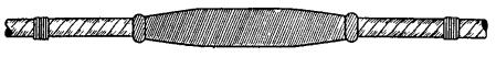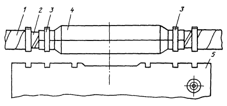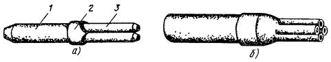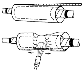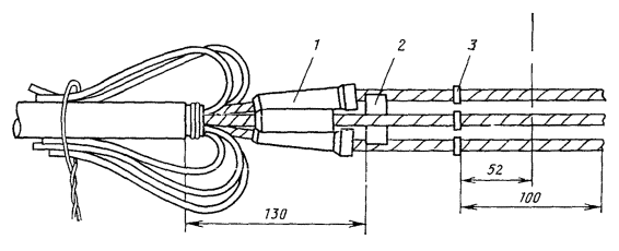 11.48. Установить монтажный станок и закрепить на нем устройство для расширения алюминиевой оболочки и запрессовки опорных втулок; подающий винт устройства вывести в крайнее положение. 11.49. Надвинуть на сердечник кабеля проходной пуансон для расширения оболочки (см. рис. 11.10). 11.50. Конец кабеля заложить в устройство таким образом, чтобы срез полиэтиленового шланга упирался во внешний торец губок держателя; закрепить конец кабеля в держателе, стянув губки винтом. Вставить пуансон в гнездо корпуса устройства, смазать рабочую часть пуансона вазелином. 11.51. Вращением подающего винта запрессовать проходной пуансон под оболочку кабеля. Подающий винт устройства вывернуть вместе с пуансоном. 11.52. Освободить кабель из губок держателя, снять с сердечника пуансон и на его место надвинуть стальную опорную втулку (см. рис. 11.11, а) и толкатель. Ввести толкатель в гнездо головки расширительного устройства и запрессовать опорную втулку под расширенную часть оболочки путем вращения подающего винта (рис. 11.12). Рис. 11.12. Конец кабеля после запрессовки опорной втулки: 1 - шланг; 2 - расширенная часть оболочки; 3 - опорная втулка 11.53. При запрессовании проходных пуансонов и опорной втулки недопустим их перекос, так как это может вызвать повреждение сердечника, прорез или разрыв оболочки в месте запрессовки. В случае, когда это по каким-либо причинам все же имеет место, необходимо заново разделать конец кабеля. 11.54. Аналогично подготовить второй конец сращиваемых кабелей. Примечание. При расширении оболочки и запрессовке опорной втулки оболочка укорачивается примерно на 5 мм на кабеле емкостью 1×4 и до 10 мм на кабеле 4×4 и более. Поэтому перед монтажом сердечника сращиваемые концы кабеля должны быть установлены таким образом, чтобы расстояние между местами среза оболочки (расширенной) соответствовало данным табл. 8.6. Соответственно расстояние от середины сростка до места среза наружного покрова (брони, внутреннего шланга) на, смонтированной муфте будет на 10 - 20 мм меньше, чем на разделанном конце кабеля до монтажа. 11.55. Зачистить металлической круглой щеткой внутреннюю поверхность соединительной алюминиевой трубки (рис. 11.11, б) на длине 30 - 40 мм с обоих концов. Зачищенную поверхность смазать кварцевазелиновой пастой и вторично зачистить щеткой под слоем пасты. Аналогично зачистить плоской стальной щеткой наружную поверхность расширенной части оболочки на кабеле со стороны А. Примечание. При необходимости устройства КИП к алюминиевой трубке должен быть предварительно (в мастерских, на базе) припаян выводной проводник. 11.56. Надвинуть алюминиевую трубку на оболочку конца кабеля со стороны А. Удалить поясную изоляцию. 11.57. Смонтировать сердечник кабеля; при этом учесть примечание к п. 11.54; восстановление поясной изоляции выполнить четырьмя слоями полиэтиленовой ленты (рис. 11.13, а). 11.58. Зачистить наружную поверхность расширенной части оболочки на кабеле со стороны Б так же, как на кабеле со стороны А (п. 11.55). 11.59. Надвинуть на упакованный сросток алюминиевую трубку так, чтобы концы ее симметрично закрывали расширенные части оболочки сращиваемых кабелей (рис. 11.13, б). Аналогично спрессовать второй конец трубки. Образовавшиеся при опрессовании на концах трубки заусенцы осторожно удалить при помощи кусачек и напильника. Общий вид сростка после опрессования показан