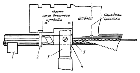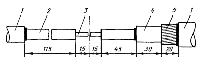 8.42. Уложенные на козлы концы сращиваемых кабелей выровнять и нанести на них отметки среза наружного покрова. Эти и последующие отметки должны строго соответствовать размерам, приведенным в таблицах разделки концов. Рис. 8.16. Разделка концов кабеля в алюминиевой оболочке и стальной гофрированной броне МКСАСтпШп-4×4×1,2: 1 - шланг; 2 - стальная гофрированная броня; 3 - шланг; 4 - алюминиевая оболочка; 5 - поясная изоляция; 6 - жилы 8.43. На расстоянии 5 - 10 мм от указанных отметок в направлении от середины сростка поверх покрова из пряжи наложить бандаж из четырех туго натянутых витков стальной отожженной проволоки диаметром 1 мм (допускается использование отходов жил кабеля). Концы проволок скрутить и отогнуть. Согласно отметкам наружный покров обрезать и удалить с концов кабеля. Если поверх брони в кабеле с наружным покровом из пряжи имеются пластикатовые ленты, их следует смотать в рулончики и прикрепить к кабелю. Удаление полиэтиленового шланга должно производиться путем кольцевого и продольного надрезов, сделанных при помощи разогретой стальной пластинки. 8.45. При наличии в кабеле с наружным полиэтиленовым шлангом наложенных поверх брони пластиковых лент, последние в процессе разделки концов следует подогреть пламенем паяльной лампы, размотать и удалить по линии обреза наружного шланга. 8.46. На стальную ленточную броню нанести отметки мест среза. На расстоянии 15 - 20 мм от отметок в сторону от середины сростка стальную броню зачистить до блеска и залудить припоем ПОССу-30-2, использовав в качестве флюса безкислотную пасту ПБК-26М. Применение в качестве флюса соляной кислоты запрещается. Залуживание должно охватить обе стальные ленты не менее чем на одну треть длины окружности кабеля с ленточной броней и не менее 50 % проволок кабеля с проволочной броней. Перепайка брони сращиваемых кабелей с изолирующими покровами шлангового типа должна производиться изолированным проводом марки ПСП (ПРППМ), зачищенные и залуженные концы которого следует подложить под бандаж на броне и пропаять вместе с ним. 8.48. В муфтах, где предусмотрено устройство контрольно-измерительных пунктов (КИП), на конце кабеля стороны А под бандаж следует подложить зачищенный и залуженный конец выводного провода (рис. 8.17). При двухкабельной системе и наружном покрове из пряжи аналогично следует подложить под бандаж выводной провод на кабеле № 1 со стороны Б, причем противоположный конец этого провода должен быть припаян к бандажу на кабеле № 2 также со стороны Б; на кабеле № 2 со стороны А выводной провод не припаивается. На кабелях с наружными изолирующими покровами шлангового типа (при двухкабельной системе) перепайка брони разных кабелей не производится и выводной проводник припаивается на каждом кабеле со стороны А. Бандаж и конец выводного провода по всей залуженной поверхности брони припаять припоем ПОССу-30-2 с использованием пасты ПБК-26М. Рис. 8.17. Устройство бандажа на броне кабеля и припайка провода КИП: 1 - наружный покров; 2 - бандаж; 3 - броня; 4 - подушка; 5 - оболочка 8.49. На расстоянии 8 - 10 мм от бандажа, в соответствии с размерами разделки концов кабеля, стальные ленты брони надрезать напильником, обломать и удалить; заусенцы удалить напильником. 8.50. Удалить подброневые покровы из бумажных лент или пряжи на расстоянии 3 - 5 мм от обреза брони. В кабелях с защитными покро