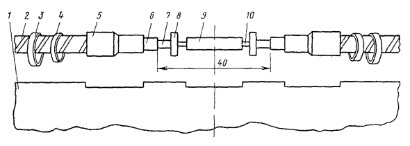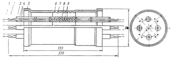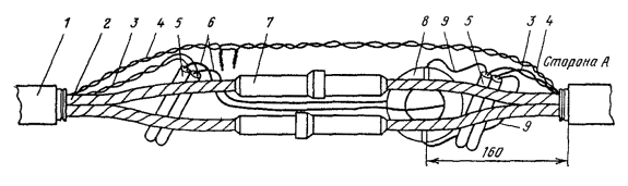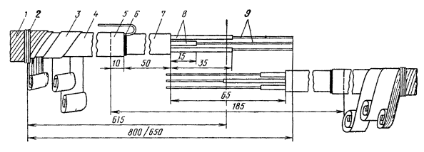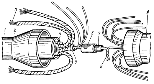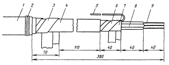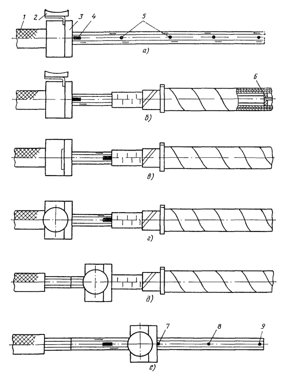 Рис. 15.36. Разделка коаксиальных пар для монтажа муфты КГС: 1 - наружный покров; 2 - броня; 3 - оболочка; 4 - поясная изоляция кабеля; 5 - изоляция коаксиальной пары; 6 - экранные ленты; 7 - внешний проводник; 8 - баллонная изоляция; 9 - внутренний проводник (условно показана только одна коаксиальная пара) 15.108. На экранные ленты коаксиальных пар надвинуть с заходом на 10 мм медные опорные втулки (см. рис. 9.31, а). На внутренние проводники надвинуть полиэтиленовые трубки (см. рис. 9.31, б) до упора их в пережим баллонной изоляции. Дальнейшее продвижение полиэтиленовой опорной трубки под баллонную изоляцию и внешний проводник на глубину 20 мм произвести плоскогубцами в процессе припайки опорной втулки. 15.109. Торцы втулки на 1/3 длины окружности припаять трубчатым припоем ПОССу-61-0,5 к внешнему проводнику и экранным лентам. Место припайки предварительно протереть чистой тканью, смоченной в бензине. Пайку произвести, по возможности, быстро, избегая перегрева. В качестве флюса при припайке втулки к стальным лентам экрана использовать пасту ПБК-26м. После пайки остатки флюса удалить тканью, смоченной в бензине. 15.110. Залудить внутренние проводники припоем ПОССу-61-0,5. 15.111. На коаксиальные пары кабеля надвинуть латунные луженые переходные втулки (рис. 15.34, а). На внутренние проводники коаксиальных пар цилиндра муфты КГС надвинуть по одной фторопластовой шайбе (рис. 15.34, б), установив ее в 2 - 3 мм от торца внешнего проводника. 15.112. Все внутренние проводники линейного и вводного кабелей задвинуть до упора в отверстия внутренних проводников цилиндра КГС, сохраняя при этом соединение одноименных пар. 15.113. Пропаять припоем ПОССу-61-0,5 внутренние проводники на стыке кабелей и цилиндра КГС. Пайку вести торцовым паяльником, по парам, начиная с линейной стороны, сначала нижнюю, потом верхнюю пару. Место пайки протереть тканью, смоченной в бензине, а затем протереть насухо. 15.114. Установить фторопластовые шайбы в 2 - 3 мм от торца внутреннего проводника коаксиальной пары цилиндра муфты КГС. 15.115. Надвинуть латунную переходную втулку (рис. 15.34, а) стороной с диаметром 7,5 мм на опорную втулку (на участок диаметром 7,1 мм). При этом переходная втулка должна быть надвинута на внешний проводник цилиндра КГС на 5 мм. Припаять концы переходной втулки к внешнему проводнику цилиндра и к опорной втулке припоем ПОССу-61-0,5 на 1/3 длины окружности. Места пайки протереть тканью, смоченной бензином, а затем протереть насухо. 15.116. После окончания пайки всех пар удалить распорный диск. Установить на смонтированные сростки коаксиальных пар полиэтиленовые втулки с продольным разрезом (рис. 15.34, в) таким образом, чтобы торцы втулок с меньшим диаметром находились около нитяного бандажа на поясной изоляции коаксиальных пар. 15.117. Сращивание симметричных пар произвести со слабиной. Центральную пару и контрольную жилу срастить в первую очередь и расположить посередине сростка между коаксиальными парами. Контрольную жилу кабелей срастить с центральной жилой цилиндра КГС. Для сращивания симметричных жил необходимо: а) на каждую жилу кабелей надвинуть полиэтиленовую гильзу 60×5×6 мм; б) отметить место скрутки, горячим ножом оплавить полиэтиленовую изоляцию и удалить ее с концов жил; в) скрутить жилы на длине 30 мм, пропаять на длине 10 мм, отогнуть скрутку и надвинуть на нее изолирующую гильзу; на расстоянии 10 - 15 мм о
