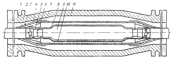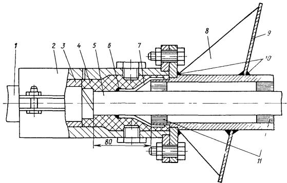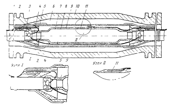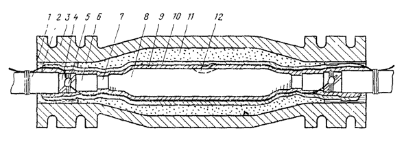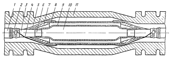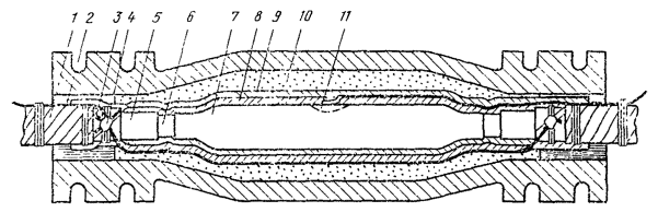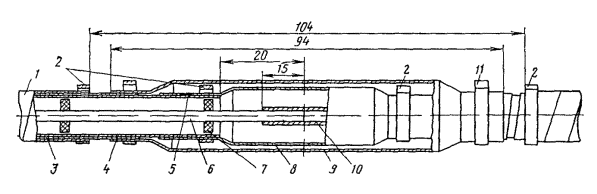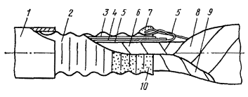 Рис. 12.18. Восстановление защитных изолирующих покровов типа БпШп горячим способом: 1 - наружный шланг; 2 - место сварки шланга и полиэтиленовых деталей; 3 - конус полиэтиленовый 4 - броня; 5 - внутренний шланг; 6 - оболочка; 7 - труба полиэтиленовая; 8 - слой ЛПК и лент; 9 - муфта металлическая; 10 - провод перепайки брони; 11 - муфта чугунная