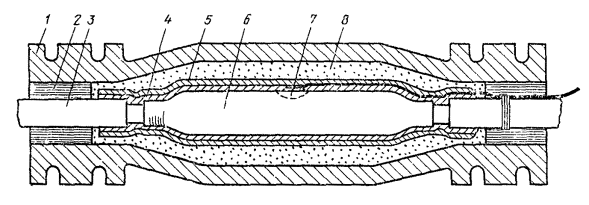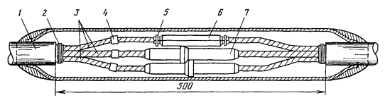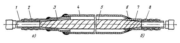 в) на кабеле в алюминиевой оболочке приклеить свинцовые конусы (см. примечание к табл. 15.3), залудить алюминиевую оболочку у места ее среза, наложить на залуженный участок бандаж для перепайки оболочки со свинцовым цилиндром муфты МИС;* г) на кабеле в стальной гофрированной оболочке залудить последнюю пастой ПМКН-40 (см. разд. 11) в местах припайки свинцовых цилиндров МИС к оболочке; д) смонтировать сердечник кабеля и упаковать сросток так же, как при монтаже соединительной муфты на кабеле такого типа; между слоями поясной изоляции уложить первый экземпляр паспорта; е) надвинуть на сросток муфту МИС, подогнать края свинцовых цилиндров муфты МИС к оболочке или к свинцовым конусам, приклеенным к алюминиевой (свинцовой) оболочке; ж) припаять концы цилиндров МИС припоем ПОССу-30-2, одновременно припаять провод КИП (от оболочки); з) восстановить изолирующие покровы в соответствии с разд. 12; и) установить и залить защитную чугунную муфту. * На стыке кабеля в алюминиевой оболочке с кабелем в свинцовой оболочке на последней рекомендуется припаять свинцовый конус, что облегчает, при необходимости, демонтаж муфты. Общий вид изолирующей муфты (в разрезе), смонтированной на стыке двух кабелей в свинцовой или стальной оболочке, показан на рис. 15.43, а в алюминиевой оболочке - на рис. 15.44. Рис. 15.43. Муфта МИС, смонтированная на стыке кабелей в свинцовой или стальной оболочке Рис. 15.44. Муфта МИС, смонтированная на стыке кабелей в алюминиевой оболочке: 1 - наружный покров; 2 - броня; 3 - полиэтиленовый шланг; 4 - оболочка; 5 - клеевой шов; 6 - свинцовый конус; 7 - муфта МИС; 8 - сросток сердечника Особенности монтажа изолирующих муфт на стыке кабелей типа КМ-8/615.136. При необходимости установки изолирующей муфты на стыке строительных длин (отрезков, участков) кабеля КМ-8/6 следует смонтировать две муфты: сначала изолирующую типа МИСк-3 (без разрезания сердечника кабеля) и рядом с ней обычную соединительную. 15.137. Для монтажа изолирующей и соединительной муфт отрыть котлован согласно рис. 15.45 и выложить соответственно концы кабелей. Рис. 15.45. Расположение в котловане соединительной (1) и изолирующей (2) муфт на кабеле КМ-8/6 15.138. Если в данном месте подлежат сращиванию кабель без изолирующих покровов с кабелем, имеющим изолирующие покровы, муфта МИС и детали для восстановления покровов над ней (ТУТ, полиэтиленовые и другие) должны быть надвинуты на конец кабеля с изолирующими покровами. Монтаж изолирующих муфт типа ГМСИ15.139. Монтаж газонепроницаемых изолирующих муфт типа ГМСИ (рис. 15.46), устанавливаемых на симметричных кабелях емкостью 7×4, 4×4 и 1×4, должен производиться так же, как при монтаже муфт типа ГМС (см. пп. 15.124 - 15.129). Рис. 15.46. Изолирующая муфта типа ГМСИ 15.140. Муфты типа ГМСИ следует устанавливать в непосредственной близости к оборудованию для содержания кабелей под постоянным избыточным давлением с учетом, что линейная сторона этих муфт должна быть соединена воздуховодом с указанным оборудованием. Монтаж изолирующих муфт при помощи клея ВК-915.142. Изолирующие промежутки образуются путем намотки стеклоленты, пропитанной клеем ВК-9, между оболочкой кабеля и свинцовыми конусами соединительной муфты, монтируемой методом склеивания. При этом перепайка оболочек со свинцовой муфтой в этом случае не производится. 15.143. Для монтажа используются те же детали и приспособления, что и при