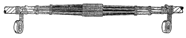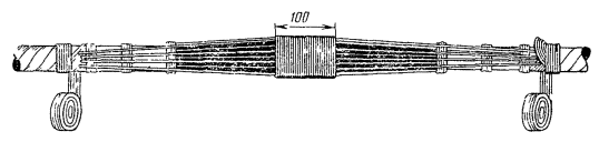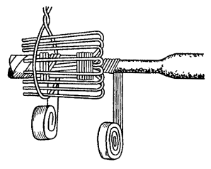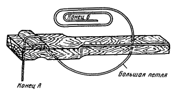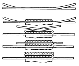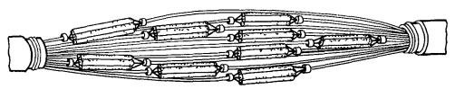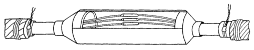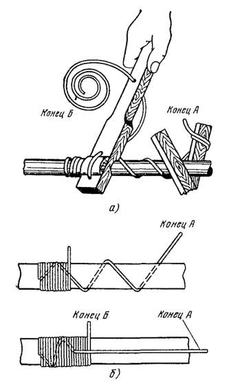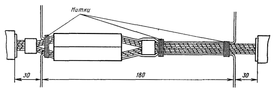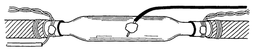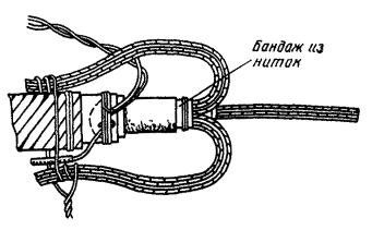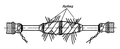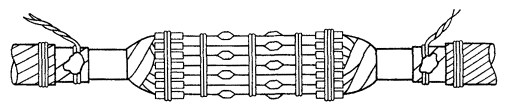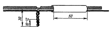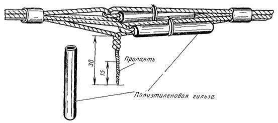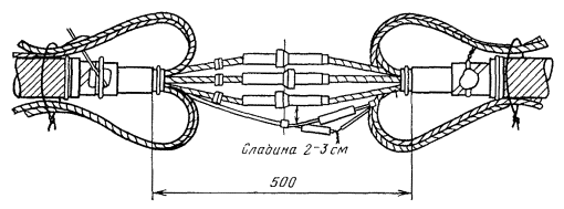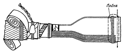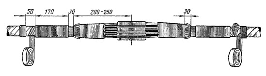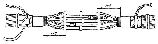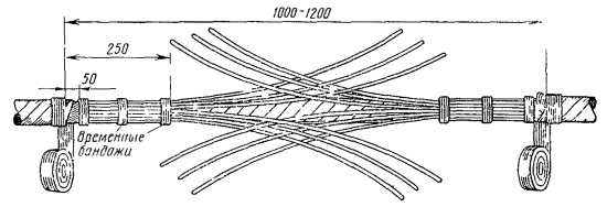 15.179. Наложить на наружный покров из пряжи бандаж из стальной или медной проволоки, обрезать пряжу и удалить ее с конца кабеля. Пластикатовые ленты, расположенные под пряжей, смотать в рулончики к месту среза пряжи и временно закрепить ниткой. 15.180. На расстоянии 25 мм от места среза наружного покрова отметить место среза брони; очистить ее, залудить, наложить бандаж из медной луженой проволоки диаметром 1,2 мм и припаять его к броне с захватом обеих лент обычным способом (см. разд. 8). Концы проволок бандажа не обрезать, а скрутить и в последующем использовать для перепайки. В муфтах, где это предусмотрено проектом, под бандаж подложить и припаять конец провода для вывода к КИП. Обрезать и удалить броню. 15.181. Наложить на бумажные ленты подброневого покрова бандаж из медной проволоки на расстоянии 30 - 35 mm от места среза брони. Оборвать около бандажа подброневой покров и алюминиевую ленту. 15.182. Концы экранных алюминиевых проволок поочередно отделить, протереть ветошью, смоченной бензином, и отогнуть (см. рис. 15.59). 15.183. На расстоянии 10 мм от места среза подброневого покрова обрезать и удалить пластикатовые и бумажные ленты, находящиеся под экранными проволоками. Очистить от битума, промыть ветошью, смоченной бензином, и протереть насухо свинцовую оболочку. 15.184. Удаление свинцовой оболочки, наложение бандажа из ниток на поясную изоляцию, монтаж и упаковку сердечника, и запайку свинцовой муфты с продольным разрезом выполнить обычным способом (см. разд. 8). 15.185. Отметить середину свинцовой муфты. Уложить вдоль муфты одну из алюминиевых проволок и на ней отметить место среза, которое должно быть на расстоянии 5 мм от середины муфты. Аналогично подготовить остальные проволоки экрана, не обрезая их. 15.186. От места отметки (в сторону среза брони) зачистить ножом или напильником алюминиевые проволоки на длине 40 - 50 мм. Зачищенный участок проволоки нагреть, пламенем паяльной лампы до 180 - 200 °С (определяется опытным путем). Одновременно нагревая пруток ЦОП и натирая им зачищенный участок проволоки, залудить ее по всему периметру на длине 35 - 40 мм. Не давая остыть проволоке, на залуженный участок наложить слой припоя ПОССу-30-2. Аналогично залудить остальные проволоки экрана. Обрезать проволоки согласно сделанным отметкам. 15.187. Разделить алюминиевые проволоки на одной из сторон сростка на две равные группы и уложить их продольно с двух боков муфты по окружности, без перехлестов, оставив открытым продольный шов свинцовой муфты. Уложенные проволоки закрепить бандажом из двух-трех витков медной луженой проволоки диаметром 0,9 - 1,2 мм. Первый виток уложить на расстоянии 5 мм от конца экранных проволок, а остальные - в сторону конуса с расстоянием между витками 1 - 2 мм (рис. 15.60). Аналогично уложить и закрепить экранные проволоки с другой стороны. Рис. 15.60. Укладка экранных проволок и закрепление их бандажом 15.188. Перепаять алюминиевые проволоки со свинцовой муфтой припоем ПОССу-30-2 таким образом, чтобы над концами проволок образовался слой припоя шириной 40 - 45 мм и толщиной 1,5 - 2 мм. Перепайку следует вести без применения стеарина. 15.189. Восстановить под броневой покров путем наложения на сросток между бандажами на броне двух слоев компаунда ЛПК и полиэтиленовых лент, поверх которых нанести два слоя МБР также с чередованием обмоткой из пластмассовых лент с 50 %-ным пере
