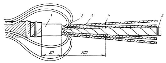 15.163. Протоколы проверки заказчиком БТД, параметры которых соответствуют нормам, должны быть переданы строительной организации вместе с термоблоками. В проверке БТД может принять участие представитель строительной организации, что следует указать в протоколе. В случае выявления дефектов заказчик должен предъявить рекламацию предприятию-поставщику в установленном порядке. 15.164. Блоки термодатчиков должны быть уложены в грунте на проектную глубину прокладки магистрального кабеля (1,2 ± 0,1 м) по трассе линии в сторону станции А. Перед вводом соединительных кабелей в цистерну удалить с их концов защитные покровы. Номера вводных патронов, в которые должны быть введены соединительные кабели, а также места расположения муфт грунтовой АРУ внутри цистерны, определяются рабочими чертежами проекта. 15.165. Для монтажа, соединительного кабеля с БТД необходимо: а) разделать конец кабеля согласно рис. 15.52; Рис. 15.52. Разделка конца кабеля для монтажа БТД: 1 - наружный покров; 2 - броня; 3 - оболочка; 4 - поясная изоляция; 5 - жилы б) надвинуть на конец кабеля свинцовый цилиндр (рис. 15.53, а), предварительно обмотав кабель бумагой; Рис. 15.53. Свинцовый корпус для БТД: а - цилиндр; б - стакан в) залудить жилы кабеля припоем ПОССу-61-0,5 на длине 10 мм. Надвинуть на четверки групповые кольца, а на жилы - изолирующие гильзы 2,5×3,5×15 мм; г) припаять концы жил кабеля к контактам БТД согласно табл. 15.7. Надвинуть гильзы на места паек, сдвинуть групповые кольца. Обмотать БТД и место припайки к нему жил кабеля с захватом оболочки тремя - четырьмя слоями кабельной бумаги. Между слоями бумаги уложить паспорт (форма 15.2);. Таблица 15.7 Распайка жил кабеля на контакты БТД