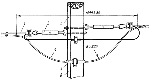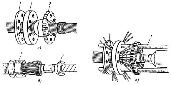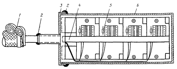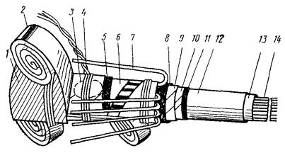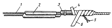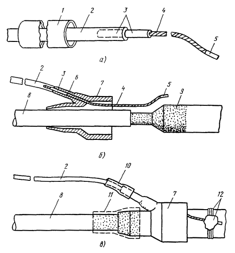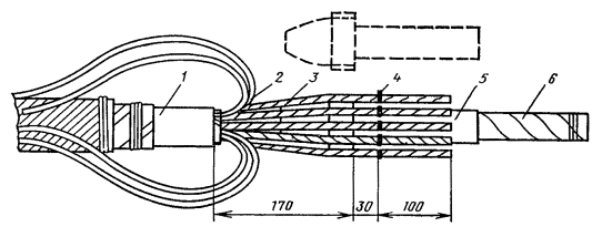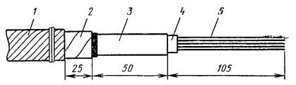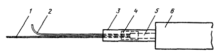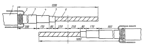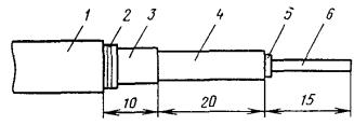 Рис. 8.13. Разделка концов кабеля в алюминиевой оболочке при монтаже клеевым способом или пайкой: 1 - наружный покров (пряжа или полиэтилен); 2 - броня; 3 - полиэтиленовый шланг; 4- алюминиевая оболочка; 5 - поясная изоляция; 6 - жилы
