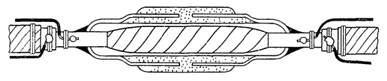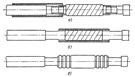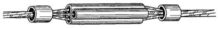 11.5. Муфты, показанные на рис. 11.1, а, б, должны применяться во всех случаях, когда имеется возможность надвинуть свинцовую муфту на один из концов сращиваемых кабелей до начала монтажа сердечника кабеля. 11.6. Муфты цилиндрические в комплекте с двумя конусами (рис. 11.1, в, г) обычно применяются при монтаже симметрирующих (стыковых) муфт высокочастотных кабелей в случаях, когда требуется многократная распайка, при сращивании алюминиевых оболочек клеевым способом, а также при монтаже кабелей большой емкости, когда диаметр сростка сердечника в 3 - 4 раза превышает диаметр кабеля по оболочке (например, на кабеле КМ-8/6). Таблица 11.4 Марки и размеры муфт для монтажа высокочастотных кабелей