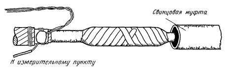 ИЗМЕРЕНИЕ РАЗНОСТИ ПОТЕНЦИАЛОВ МЕЖДУ СООРУЖЕНИЕМ СВЯЗИ И РЕЛЬСАМИ ЭЛЕКТРИФИЦИРОВАННОГО ТРАНСПОРТА18.118. Разность потенциалов между сооружением связи и рельсами измеряют в колодцах, контрольно-измерительных пунктах или шурфах, отрываемых на расстоянии 10 - 30 м от рельс, на участках пересечений и сближений сооружений связи с рельсами для определения наиболее рациональных мест подключения электродренажной защиты. 18.119. Как правило, измерение разности потенциалов «сооружение связи - рельс» производят одновременно с измерением разности потенциалов сооружения связи относительно земли на тех участках, где положительные потенциалы сооружения связи по отношению к земле максимальны, а также на участках пересечения сооружений связи с рельсами. 18.120. Необходимо, чтобы за период измерений мимо пункта наблюдений прошло не менее, чем по два электропоезда (трамвая) в разных направлениях. 18.121. Схема измерения разности потенциалов между кабелем и рельсами на участке пересечения показана на рис. 18.16. Рис. 18.16. Схема измерения разности потенциалов между кабелем и рельсами на участке пересечения: 1 - колодец или КИП; 2 - кабель; 3 - рельсовые пути ИЗМЕРЕНИЕ РАЗНОСТИ ПОТЕНЦИАЛОВ МЕЖДУ ПОДЗЕМНЫМ СООРУЖЕНИЕМ СВЯЗИ И СОСЕДНИМ ПОДЗЕМНЫМ МЕТАЛЛИЧЕСКИМ СООРУЖЕНИЕМ18.122. Измерение разности потенциалов между подземными сооружениями связи и другими подземными металлическими сооружениями (трубопроводами, силовыми кабелями и т.д.) производят в колодцах, контрольно-измерительных пунктах или шурфах, в местах пересечений и наибольших сближений между ними (рис. 18.17). На основе этих измерений устанавливают возможность осуществления совместной защиты. При проведении измерений на силовых кабелях следует пользоваться оборудованными на них контрольно-измерительными пунктами и соблюдать действующие правила по технике безопасности. Измерения должны проводиться в присутствии представителей организаций, в ведении которых находятся соседние подземные металлические сооружения. Рис. 18.17. Схема измерения разности потенциалов между кабелем и соседним сооружением в колодцах: 1 - трубопровод, 2 - кабель, 3 - электрод со стальным наконечником; 4 - электрод со свинцовым наконечником 18.123. Измерения разности потенциалов «подземное сооружение связи - соседнее сооружение» целесообразно проводить одновременно с измерением разности потенциалов сооружения связи относительно земли. 18.124. Для создания контакта с подземными металлическими сооружениями, проложенными в канализации, используют электроды из того же металла, из которого сделано само сооружение. ИЗМЕРЕНИЕ СОПРОТИВЛЕНИЯ ИЗОЛЯЦИИ МЕТАЛЛИЧЕСКИХ ОБОЛОЧЕК И БРОНИ КАБЕЛЕЙ СВЯЗИ18.125 Измерение величины сопротивления изоляции металлических оболочек кабелей связи (свинцовых, алюминиевых и стальных) и брони рекомендуется проводить только для тех типов кабелей, которые имеют специальные изолирующие покровы шлангового или ленточного типов, обладающие высокими диэлектрическими свойствами. 18.126. Измерение величины сопротивления изоляции защитного покрова оболочек кабелей связи и брони, имеющих специальный защитный покров, следует проводить на постоянном токе на длине усилительного или выделенного участка с обоих его концов при помощи кабельных приборов типа ПКП, мостов типов КП-50, Р-334 и других или приборами MOM-3, M-4100. 