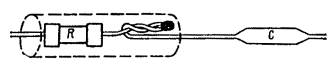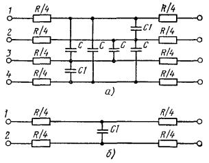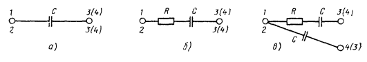 10.15. Для монтажа симметрирующих муфт должны применяться свинцовые муфты, показанные на рис. 11.1. При этом если по нормам трудоемкости или по практическому опыту известно, что в течение одного рабочего дня закончить монтаж невозможно, следует применять муфты с отрезными конусами или с продольным разрезом, чтобы на время перерыва муфта была запаяна. 10.16. При соединении четверок (пар) по заданным операторам скрещивания необходимо строго следить, чтобы отбор жил для сращивания начинался с конца стороны А, в противном случае эффект симметрирования не будет достигнут. 10.17. В процессе монтажа симметрирующей муфты спайщик обязан после сращивания каждой четверки или экранированной пары записать в паспорт на монтируемую муфту фактически выполненный им оператор скрещивания (форма 8.2). Паспорт составляется в двух экземплярах, из которых первый следует уложить в муфту (при упаковке сростка), а второй сдать руководителю монтажных работ. 10.18. После сращивания всех жил, но до запайки муфты следует произвести проверку правильности соединения путем прозвонки. Результаты прозвонки должны быть зафиксированы в протоколе по форме 22.7. По результатам прозвонки определяется фактически выполненный оператор, его соответствие заданному, а также результирующий оператор, если на прозваниваемом отрезке имеется несколько муфт, в которых производилось скрещивание. 10.19. Запайка муфты, заливка защитной муфты, установка замерного столбика (фиксация места расположения муфты) и засыпка котлована должны производиться так же, как при монтаже прямой муфты. МОНТАЖ КОНДЕНСАТОРНЫХ МУФТ НА НИЗКОЧАСТОТНОМ КАБЕЛЕ10.20. Сращивание жил в конденсаторных муфтах низкочастотных кабелей производится либо напрямую (т.е. цвет в цвет), либо со скрещиванием по операторам, выбранным симметрировщиком на основании результатов измерений емкостных связей и емкостной асимметрии в полушагах симметрирования (см. табл. 10.1) с подключением, при необходимости, конденсаторов типа КТИ. 10.21. До установки симметрирующих конденсаторов в муфту следует проверить их электрическое сопротивление изоляции и электрическую прочность; эти характеристики должны соответствовать требованиям ГОСТ. 10.22. В зависимости от электрических параметров кабеля симметрировщиком могут быть заданы спайщику следующие схемы включения конденсаторов в четверку: а) между жилами разных пар в четверке по схеме рис. 10.6, а; б) между жилами и оболочкой кабеля («на землю») (рис. 10.6, б). Емкость конденсаторов, подлежащих включению, определяется симметрировщиком. Счет (нумерация) жил, между которыми включаются конденсаторы, должен вестись на кабеле стороны А. 10.23. В процессе подбора необходимых емкостей конденсаторы предварительно подключают холодной скруткой к временно соединенным жилам и только после измерений результатов симметрирования припаивают к скрутке жил напостоянно. Рис. 10.6. Схема включения конденсаторов: а - между жилами; б - между жилами и оболочкой («на землю») 10.24. При включении конденсаторов между жилами внутри четверки по схеме рис. 10.6, а каждый вывод конденсатора следует пропустить сквозь изолирующую гильзу той жилы, к которой он должен быть подключен. Конец выводного проводника необходимо зачистить, навить на скрутку заподлицо с ней (излишнюю длину удалить) и пропаять в стаканчиковом паяльнике как обычну