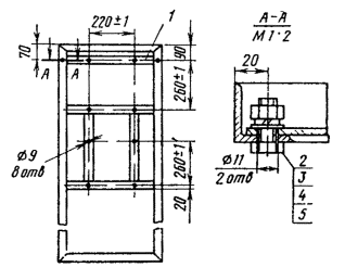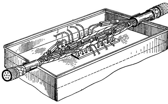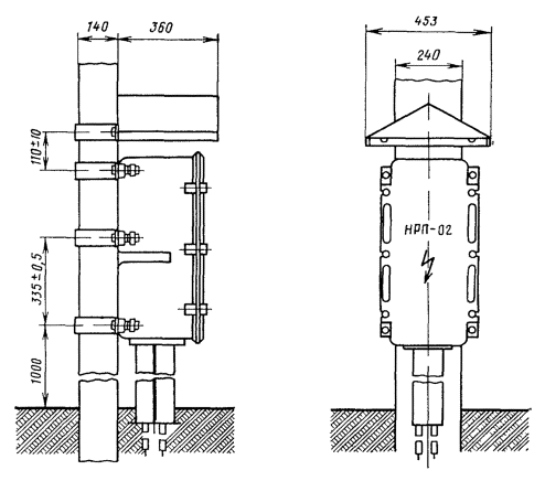 Рис. 15.6. Необслуживаемый усилительный пункт со стабкабелями для системы передачи К-300: 1 - наземная часть; 2 - щиток КПП; 3 - контейнер; 4 - штырь заземления; 5 - отмостка; 6 - стабкабель; 7 - бетонная плита; 8 - муфта КГС; 9 - линейный кабель; 10 - блок термодатчиков 15.35. Контейнеры необслуживаемых регенерационных пунктов типа НРП-К2 (рис. 15.7) системы передачи ИКМ-120 должны устанавливаться в отдельных специально построенных колодцах кабельной канализации типа ККС-5; допускается установка в нишах и технических подвалах зданий. В состав НРП-К2 входит герметичная вводная муфта с четырьмя стабкабелями (рис. 15.8). В качестве стабкабеля применяется кабель марки ЗКАШп-1×4×1,2. Рис. 15.7. Контейнер НРП-К2 со стабкабелями для системы ИКМ-120 15.36. До установки колодца в углах котлована должны быть заглублены вертикальные электроды для оборудования заземляющего устройства. В качестве электродов следует использовать некондиционные трубы диаметром 48 мм, угловую сталь 50×50×5 мм длиной 2,5 м. Соединение электронов между собой производится стальной полосой 40×4 мм. 15.37. Контейнер в колодец следует опускать с помощью крана. Металлический канат должен крепиться к рым-болту и двум лапам со стороны муфты ввода так, чтобы при опускании контейнера стабкабели были направлены вверх, обеспечивая свободный проход контейнера через горловину колодца. Радиус изгиба стабкабелей должен быть не менее 410 мм. 15.38. Во время опускания контейнера людям находиться в колодце запрещается. 15.39. Включение НРП в одночетверочную кабельную линию должно осуществляться путем монтажа соединительных муфт на стыке стабкабелей НРП с линейными кабелями. Включение НРП-К2 в кабельную линию с применением многопарного кабеля (например, МКС-4×4×1,2) должно осуществляться путем монтажа четырех разветвительных муфт на стыке стабкабелей с линейными кабелями. При этом в зависимости от количества предусмотренных данным проектом (очередью) систем ИКМ-120 стабкабели НРП впаиваются в разветвительную муфту. Остальные четверки линейного кабеля (не используемые для системы ИКМ-120 по данному проекту) в разветвительной муфте должны быть соединены с отрезками одночетверочных кабелей, при помощи которых эти четверки в данном пункте спрямляются или используются для других систем передачи. По мере увеличения количества систем ИКМ-120 стабкабели НРП сращиваются с одночетверочными кабелями, выведенными из разветвительной муфты без ее демонтажа и нарушения действующих связей. 15.40. Контейнеры НРП-02 системы ИКМ-120, как правило, должны устанавливаться на железобетонной опоре прямоугольного сечения (рис. 15.9). Крепление корпуса к опоре должно производиться при помощи специального комплекта монтажных деталей, поставляемых предприятием-изготовителем вместе с контейнером НРП-02. В состав НРП-02 входит герметичная вводная муфта с четырьмя стабкабелями марки ЗКПБ-1×4×1,2 (см. рис. 15.8), при помощи которых контейнер включается в кабельную линию. Рис. 15.9. Контейнер НРП-02 для системы НКМ-120, установление на железобетонной опоре 15.41. Контейнеры НРП-Г8 для системы ИКМ-120 заглубляют в грунт примерно на 2/3 высоты корпуса и устанавливают на железобетонной плите (рис. 15.10). В состав НРП-Г8 входят четыре вводно-кабельные устройства (УВК) со стабкабелями (рис. 15.11), предназначенные для герметизации концов линейных кабелей и подключения к кабелю линейных 