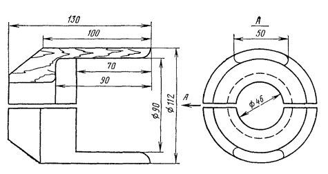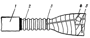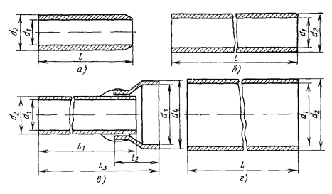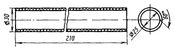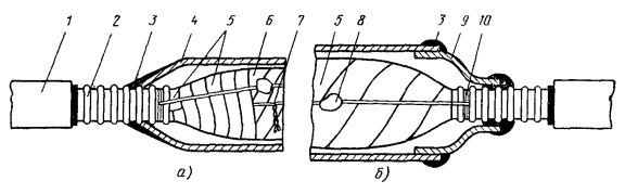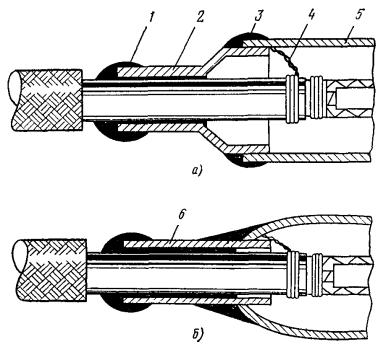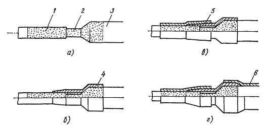 Рис. 12.3. Конус полиэтиленовый для восстановления покровов комбинированным способом Рис. 12.4. Конус полиэтиленовый с выводом для КИП Рис. 12.5. Конус полиэтиленовый с выводом для КИП для кабеля типа КМА-4 Рис. 12.6. Труба полиэтиленовая Рис. 12.7. Полумуфты полиэтиленовые 12.18. Восстановление защитных изолирующих покровов шлангового типа при помощи ТУТ и полиэтиленовых (пластмассовых) деталей (комбинированный способ) должно производиться следующим образом: а) выполнить работы, изложенные в п. 12.10, а; б) до сращивания сердечника надвинуть на концы кабеля ТУТ и пластмассовые детали; в) зачистить шкуркой или наждачным полотном пластмассовые шланги на длине 150 - 200 мм от их торцов, а также участки пластмассовых деталей, на которых предстоит усадках ТУТ; г) выполнить работы, изложенные в п. 12.10, г; д) нагреть в металлической емкости клей-расплав ГИПК 14-16 до 80 - 90 °С; е) прогреть металлическую муфту и оголенные участки металлической оболочки слабым открытым пламенем паяльной лампы до 50 - 60 °С; ж) нанести кистью сплошной равномерный слой клея-расплава ГИПК 14-16 на оголенные участки оболочки, конуса металлической муфты с захватом ее цилиндрической части на расстоянии, равном длине цилиндрической части полиэтиленового конуса (рис. 12.8, а); з) надвинуть полиэтиленовые конуса на металлическую муфту до упора (рис. 12.8, б); и) прогреть полиэтиленовый конус и прилегающий к нему участок полиэтиленового шланга слабым пламенем паяльной лампы до 50 - 60 °С; к) надвинуть на конус укороченный отрезок ТУТ таким образом, чтобы ее конец упирался в расширяющуюся часть конуса, а середина совпадала с торцом узкой части полиэтиленового конуса, т.е. чтобы перекрытие отрезком ТУТ шланга кабеля и полиэтиленового конуса было примерно одинаковым. Аналогично установить укороченный отрезок ТУТ на другом конце сростка; л) произвести усадку ТУТ с обоих концов сростка и проверить качество усадки согласно п. 12.10, з (рис. 12.8, в); м) надвинуть на сросток основную ТУТ таким образом, чтобы концы ее перекрывали полиэтиленовые конуса согласно табл. 12.1. Произвести усадку основной ТУТ и проверить качество усадки согласно п. 12.10, ж, з (рис. 12.8, г); н) выполнить работы, предусмотренные п. 12.10, и рис. 12.1, е. Рис. 12.8. Восстановление изолирующих покровов комбинированным способом при помощи пластмассовых деталей и ТУТ: а - нанесение компаунда; б - установка полиэтиленового конуса; в - установка и усадка укороченной ТУТ; г - усадка основной ТУТ: 1 -шланг; 2 - металлическая оболочка; 3 - металлическая муфта; 4 - конус полиэтиленовый; 5 - укороченный отрезок ТУТ; 6 - основная ТУТ 12.19. Вместо полиэтиленовых конусов могут быть использованы полиэтиленовые полумуфты (рис. 12.7). Над стыком полумуфт между собой, а также полумуфт со шлангом кабеля усаживаются отрезки ТУТ (рис. 12.9) с учетом требований, изложенных в п. 12.6. Рис. 12.9. Восстановление изолирующих покровов комбинированным способом при помощи полиэтиленовых полумуфт и ТУТ: 1 - шланг; 2, 6 - ТУТ; 3, 4 - оболочка и муфта, покрытые компаундом; 5 - полиэтиленовые полумуфты ОСОБЕННОСТИ УСТАНОВКИ КИП ПРИ ИСПОЛЬЗОВАНИИ ТУТ12.20. Восстановление защитного изолирующего покрова при помощи ТУТ на муфте с выводом КИП должно производиться следующим образом: а) при разделке кабеля до монтажа сростка надвинуть на сращиваемые концы полиэтиленовые конуса с патрубком для вывода КИП (см. рис. 12.4, 12.5); б) снять