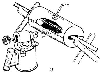 9.107. После выкладки кабелей в котловане (колодце) отметить середину сростка. Обрезать концы кабелей по сделанной отметке и очистить их от загрязнений. 9.108. Надрезать и удалить полиэтиленовый шланг на кабеле стороны А на расстоянии 130 мм от конца, а на стороне Б - 60 мм (рис. 9.42, а). Очистить алюминиевый внешний проводник от битумного состава ветошью, смоченной бензином. Рис. 9.42. Этапы монтажа кабеля типа ВКПАШп: а - разделка концов; б - сращивание внутреннего проводника; в - восстановление изоляции; г - сращивание внешнего проводника (оболочки) 1 - полиэтиленовый шланг; 2 - внешний проводник; 3 - внутренний проводник; 4 - трубка алюминиевая; 5 - гильза медная разрезная; 6 - трубка полиэтиленовая 9.109. Надрезать по окружности внешние проводники сращиваемых кабелей на расстоянии 15 мм от конца. Отделить надрезанные участки, отгибая их от оси кабеля, и удалить. 9.110. Надрезать по окружности пористую полиэтиленовую изоляцию около торца внешнего проводника и удалить надрезанные участки изоляции с концов кабелей. При надрезании полиэтиленового шланга и пористой полиэтиленовой изоляции не допускать сквозных (до металла) надрезов во избежание повреждений внешнего и внутреннего проводников. 9.111. Удалить с помощью буравчика (см. рис. 9.40, б) пористую полиэтиленовую изоляцию из-под внешних проводников на длине 30 - 35 мм от их обреза. 9.112. Ввести под внешние проводники, пользуясь бородком (см. рис. 9.40, в) и молотком, стальные опорные втулки (рис. 9.41, а) до совпадения их торцов с местами среза внешних проводников. 9.113. Залудить концы внутренних проводников на длине15 мм припоем ПОССу-61-0,5. 9.114. Зачистить стальной плоской щеткой наружную поверхность внешнего проводника конца кабеля со стороны А на длине 30 - 35 мм от места среза. Смазать зачищенную поверхность кварцевазелиновой пастой и зачистить вторично, не удаляя пасту. 9.115. Зачистить стальной круглой щеткой (см. рис. 9.40, г) внутреннюю поверхность алюминиевой соединительной трубки (см. рис. 9.41) на длине 35 - 40 мм с обоих концов. Смазать зачищенные поверхности кварцевазелиновой пастой и зачистить вторично, не удаляя пасту. 9.116. Надвинуть на конец кабеля стороны А алюминиевую соединительную трубку (см. рис. 9.40, в), а на конец Б - полиэтиленовую трубку (см. рис. 9.41). 9.117. Уложить на монтажный станок сращиваемые концы кабелей (рис. 9.42, а). Надвинуть на внутренний проводник одного из концов медную гильзу (рис. 9.41, б). Закрепить концы кабелей так, чтобы торцы внутренних проводников плотно соприкасались. 9.118. Сдвинуть медную гильзу так, чтобы ее середина находилась на стыке внутренних проводников (рис. 9.42, б). При этом продольный разрез гильзы должен быть расположен сверху. Обжать гильзу пассатижами. Пропаять гильзу по продольному разрезу припоем ПОССу-61-0,5 Наплывы и подтеки припоя не допускаются. Протереть место пайки чистой тканью, смоченной бензином, и просушить. 9.119. Отвернуть верхнюю гайку штокового пресса (рис. 9.40, а). Вынуть шток из цилиндра. Засыпать полиэтилен в гранулах в. цилиндр пресса. Гранулы должны быть чистыми и сухими. Ввести шток с поршнем в цилиндр пресса, уплотнить гранулы и завернуть верхнюю гайку пресса. 9.120. Установить штоковый пресс в вертикальное положение, заглубив штырь в грунт. Умеренным пламенем паяльной лампы, равномерно перемещая его по поверхности пресса, вести обогрев до расплавления полиэтилена (260 - 270 °С). Контро