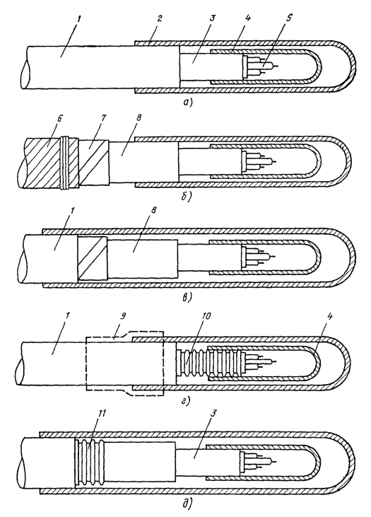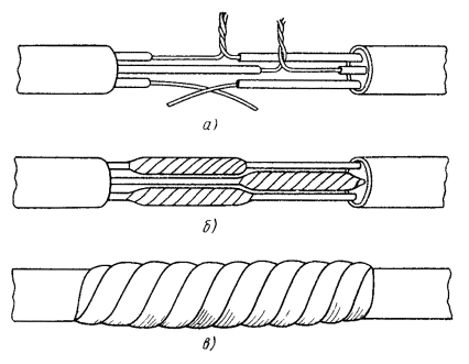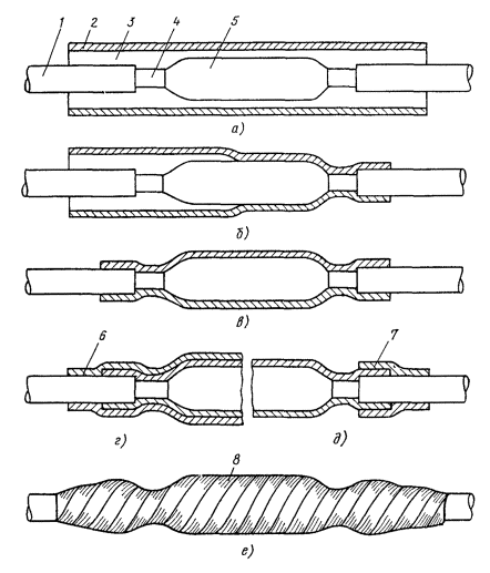 12.9. Восстановление защитных изолирующих покровов при монтаже муфт следует производить либо непосредственно термоусаживаемыми трубками (одной или двумя - в зависимости от типа кабеля, конструкции ТУТ и т.д.), либо в комбинации ТУТ с пластмассовыми деталями, предназначенными для этой цели; в последнем случае отрезки ТУТ должны использоваться для герметизации, стыков пластмассового изолирующего шланга кабеля с пластмассовыми деталями, а также последних между собой. а) очистить от загрязнений пластмассовые шланги кабелей (предварительно выложенных по котловану или колодцу и разделанных в соответствии с размерами для данного типа кабеля) на длине 0,8 - 1 м от торца, протереть их чистой ветошью, смоченной бензином или ацетоном; б) до начала сращивания элементов сердечника надвинуть на концы кабеля ТУТ, а при комбинированном способе и полиэтиленовые детали; Примечание. При необходимости пряжу наружного покрова и бронеленты следует размотать на расстоянии, необходимом для временного размещения на концах сращиваемых кабелей указанных выше деталей с последующим (после монтажа сростка) восстановлением бронелент и пряжи и закреплением их проволочным бандажом. в) зачистить шкуркой или наждачным полотном пластмассовые шланги на длине 150 - 200 мм от их торцов; г) протереть ветошью, смоченной бензином или ацетоном, смонтированную металлическую муфту, оголенные участки металлической оболочки и зачищенные участки шлангов; д) прогреть муфту, оголенные участки оболочки и прилегающие участки шланга на расстоянии 80 - 100 мм от его торца слабым пламенем паяльной лампы до 50 - 60 °С; е) надвинуть на сросток ТУТ, расположив ее симметрично относительно середины сростка (рис. 12.1, а); ж) произвести усадку ТУТ, для чего направить пламя горелки или паяльной лампы на середину ТУТ и, равномерно прогревая ее по окружности, перемещать пламя от середины сростка к одному из ее концов, обеспечивая полную усадку ТУТ (рис. 12.1, б). Аналогично выполнить усадку второй половины ТУТ (рис. 12.1, в); з) проверить качество усадки трубки внешним осмотром. При правильной усадке ТУТ должна плотно прилегать к кабелю, оболочке (дополнительному покрытию) и металлической муфте по всей длине. Под трубкой не должно быть воздушных включений. Из-под трубки с обоих концов должен выступать подклеивающий слой пояском шириной 1 - 2 мм; и) обмотать сросток с захватом шланга на 25 - 30 мм и 50 %-ным перекрытием одним слоем стеклоленты, пропитанной битумным компаундом или битумом (рис. 12.1, е). Концы лент закрепить бандажом из проволок или капроновых ниток. Примечание. При расположении муфты в колодце кабельной канализации и в помещении для ввода кабелей обмотка стеклолентой не производится. Рис. 12.1. Восстановление изолирующих шланговых покровов при помощи ТУТ: a - установка ТУТ над сростком; б - усадка ТУТ на одном из концов; в - усадка ТУТ на другой стороне; г - двухслойное наложение ТУТ; д - использование укороченных отрезков ТУТ; е - обмотка сростка стеклолентой: 1 - шланг; 2 - ТУТ; 3 - подклеивающий слой, 4 - оболочка кабеля; 5 - муфта; 6 - верхняя TУT; 7 - укороченная ТУТ; 8 - стеклолента 12.11. При двухслойном наложении ТУТ (с подклеивающим слоем), после выполнения работ, изложенных в пп. 12.10, а - и, и остывания сростка до 50 - 60 °С необходимо: а) протереть чистой ветошью, смоченной бензином или ацетоном, первую (нижнюю) ТУТ и учас