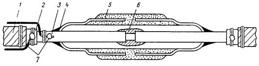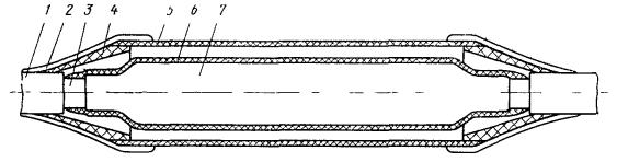 12.26. Восстановление защитных изолирующих покровов типа Бп (кабели типа МКСАБп/ЗКАБп, ТЗПАБп и др.) горячим способом должно производиться так же, как покровов типа Шп (см. п. 12.25) с учетом следующего: а) в качестве полиэтиленовой муфты используются полиэтиленовые конусы с продольным разрезом и полиэтиленовая трубка. Конусы устанавливаются на места сварки после сращивания сердечника, наложения ЛПК на сросток и обмотки его полиэтиленовыми лентами, а трубка надвигается на один из сращиваемых концов кабеля до монтажа сердечника и сдвигается на конусы перед сваркой; б) после испытания герметичности полиэтиленовой муфты (см. п. 12.25, к) произвести скрутку и перепайку проводов от бандажей на броне; провод к КИП (от оболочки) уложить вдоль сростка в сторону Б, а от брони - в сторону А и прикрепить бандажом к кабелю; обмотать сросток смоляной лентой с захватом джута на 30 - 40 мм с каждой стороны. 12.27. Восстановление защитных изолирующих покровов типа БпШп (кабели типа МКСАБпШп, МКСБпШп, ТЗПАБпШп и др.) горячим способом должно производиться следующим образом: а) провода для перепайки брони, а в местах, где это предусмотрено проектом, и провода (запрессованные в полиэтиленовые конуса) для вывода к КИП, расположить вертикально; б) выполнить работы, предусмотренные п. 12.21, б, в; при этом на сросток нанести слой ЛПК, отступив от места среза наружного шланга на 5 - 7 мм с каждой стороны, а полиэтиленовые ленты намотать вплотную к местам среза наружного шланга; ЛПК не должен попасть на шланг; конец четвертого слоя полиэтиленовой ленты (без промазки ЛПК) закрепить на конце наружного шланга; в) провода перепайки брони уложить вдоль сростка, концы их скрутить и пропаять, место спайки изолировать чередующимися тремя слоями ЛПК и полиэтиленовых лент с захватом изоляции проводов на 30 - 40 мм; г) выполнить работы, изложенные в п. 12.25, г - к, имея в виду приварку конусов полиэтиленовой муфты к наружному шлангу кабеля и трубке; провод к КИП от брони уложить вдоль сростка в сторону А, а провод от оболочки (металлической муфты) - в сторону Б и прикрепить их бандажом к кабелю на расстоянии 30 - 40 мм от узкой части конуса; д) удалить со сростка остатки мыльного раствора, просушить его и обмотать слоем смоляной ленты; концы ленты закрепить. Восстановление изолирующих покровов при помощи полиэтиленовых деталей (горячим способом) показано на рис. 12.16 - 12.20. Рис. 12.16. Восстановление защитных изолирующих покровов типа Шп горячим способом: 1 - наружный шланг; 2 - место сварки полиэтиленовых деталей между собой и со шлангом; 3 - оболочка; 4 - полиэтиленовый конус; 5 - полиэтиленовая труба; 6 - слой ЛПК из полиэтиленовых лент; 7 - металлическая муфта