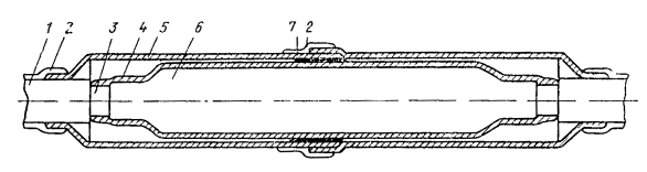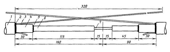 Рис. 15.40. Разделка кабеля для монтажа изолирующей муфты: 1 - наружный покров; 2 - броня; 3 - оболочка; 4 - изолирующий промежуток на оболочке е) на свинцовой оболочке посередине между местами среза брони сделать два кольцевых надреза на расстоянии 10 мм друг от друга, а между ними - продольный надрез. Удалить вырезанную свинцовую полоску оболочки. Место выреза оболочки обмотать полиэтиленовой лентой с захватом оболочки на 15 - 20 мм с каждой стороны (рис. 15.41). Заполнить паспорт на монтаж муфты и закрепить его нитками поверх намотки из полиэтиленовых лент; Рис. 15.41. Обмотка изолирующего промежутка полиэтиленовыми лентами ж) надвинуть на место монтажа изолирующую муфту; при помощи деревянного молотка придать краям ее свинцовых цилиндров форму конуса, плотно прилегающего к оболочке. Запаять припоем ПОССу-30-2 места стыка муфты с оболочкой; з) припаять конец провода для КИП к свинцовому цилиндру муфты с линейной стороны. Длина провода должна быть достаточной для подключения его противоположного конца к щитку КИП в наземной части НУП; н) проверить герметичность муфты местным давлением путем подачи сжатого воздуха через вентиль, впаянный в конец вводного кабеля; к) установку и заливку чугунной муфты выполнить так же, как при монтаже соединительных муфт (см. разд. 8); л) при монтаже изолирующих муфт на кабеле с изолирующими защитными покровами последние должны быть восстановлены одним из способов, изложенным в разд. 12. При использовании для восстановления изолирующих покровов ТУТ или полиэтиленовых деталей их следует надвинуть на конец кабеля до монтажа МИС. Общий вид муфты (в разрезе) до наложения изолирующих покровов показан на рис. 15.42. Рис. 15.42. Муфта МИС, смонтированная на подходе к НУП (без нарушения сердечника кабеля): 1 - наружный покров; 2 - броня; 3 - оболочка; 4 - пайка; 5 - муфта; 6 - изолирующий промежуток; 7 - вывод к КИП 15.135. При монтаже изолирующих муфт типа МИС на стыке двух кабелей*, когда муфта является одновременно соединительной, необходимо: а) выполнить работы, изложенные в п. 15.134, а - г; б) разделать концы кабелей по размерам, приведенным в табл. 15.3, выполнив работы по залуживанию брони, наложению и припайке бандажа, подпайке провода КИП (от брони) так же, как при монтаже соединительных муфт. * На стыке кабелей с оболочками из разнородных материалов, при соединении линейного кабеля с вводным, при выделении участков защиты и т.п. Таблица 15.3 Разделка концов кабеля при монтаже изолирующих соединительных муфт типа МИС (на стыке строительных длин)